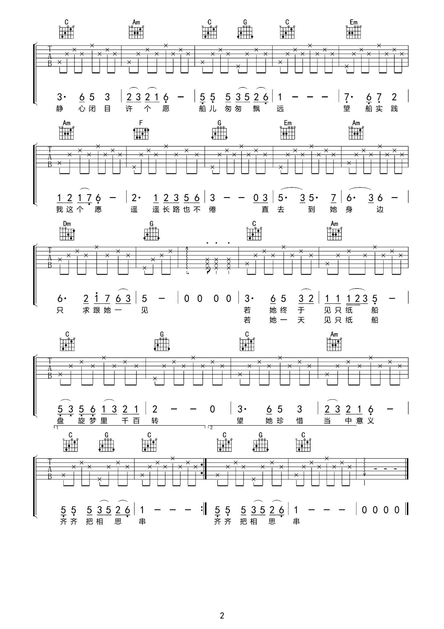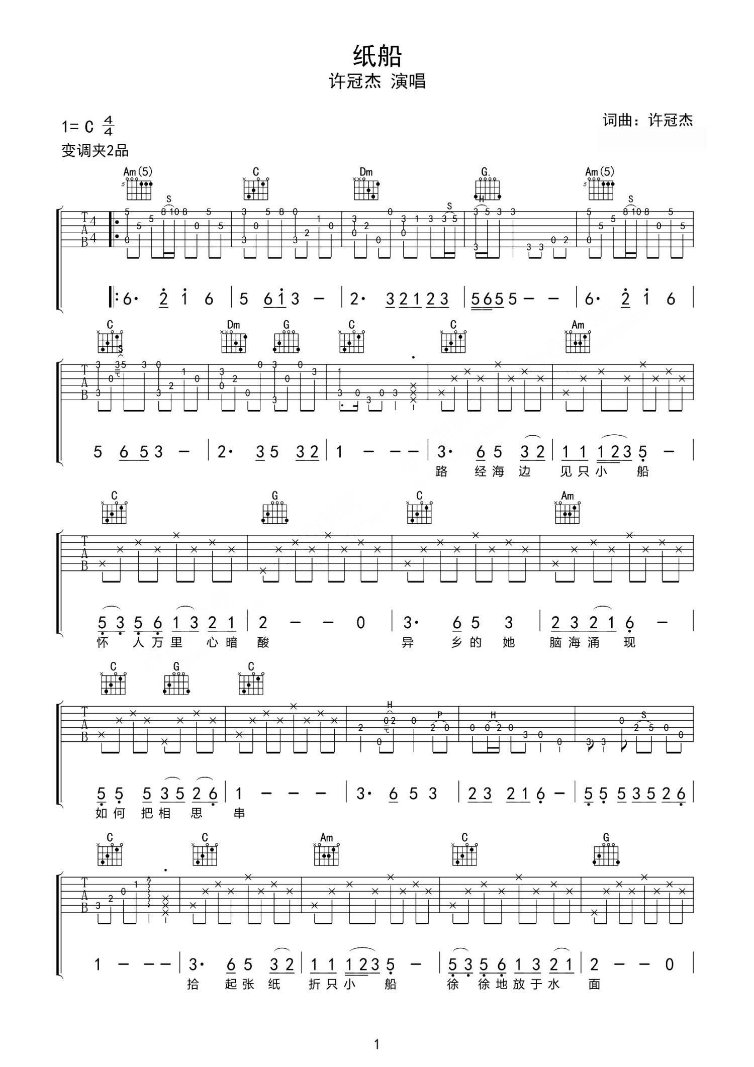曲谱介绍: 许冠杰《纸船》吉他谱_C调吉他弹唱谱