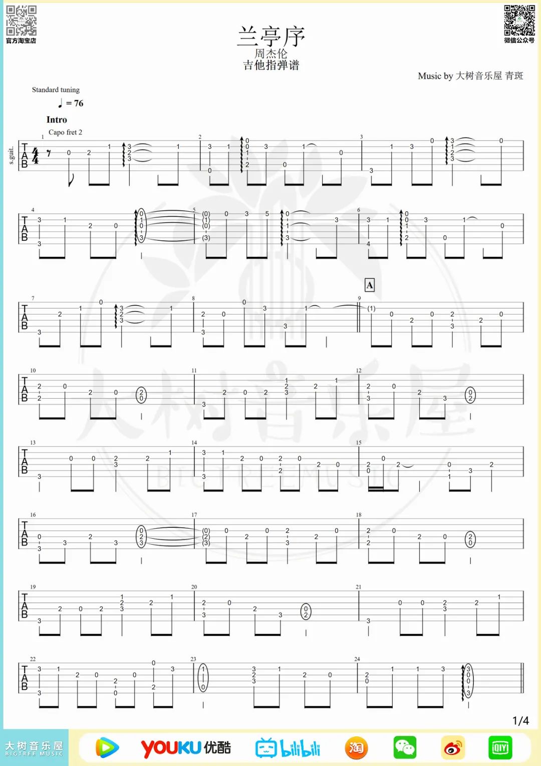 曲谱介绍: 吉他谱介绍:兰亭序指弹吉他谱,周杰伦的一首指弹吉他曲目,这首曲子采用的是标准调弦,4/4拍的节奏,无需特殊调音。演奏时建议夹变调夹2品,也可根据个人实际情况选择。曲谱由琴谱网更新上传,共4张高清图片指弹吉他谱例,来源于@大树音乐屋编配出品。一边看着这首歌的MV,一边听着这首歌,令人回味无穷。能够拿“兰亭临帖,行书如行云流水”的摹本拓字典故,来与“雨打蕉叶,又潇潇了几夜,我等春雷来提醒你爱谁”之心事密缝加以结合,已然是词作者的一绝。 兰亭序指弹吉他教学