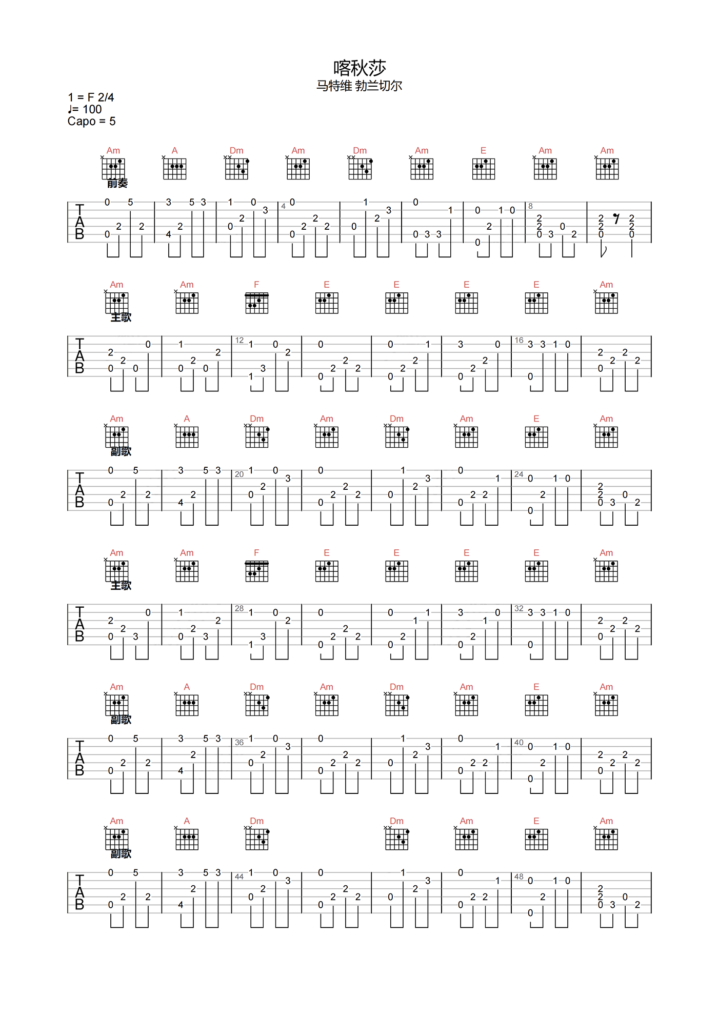 曲谱介绍: 喀秋莎指弹吉他谱,共有2张高清图片谱例,《喀秋莎》指弹谱,选用C调指法,CAPO推荐夹5品弹奏,速度控制在100拍每分钟,节奏拍号2/4,难度3级较简单。 非常经典的苏联歌曲,明快的节奏旋律质朴无华,刻画出前苏联大地回春时的优美景色,和一个名叫喀秋莎的姑娘对远离故乡去保卫边疆的情人的思念。 指弹谱详情
