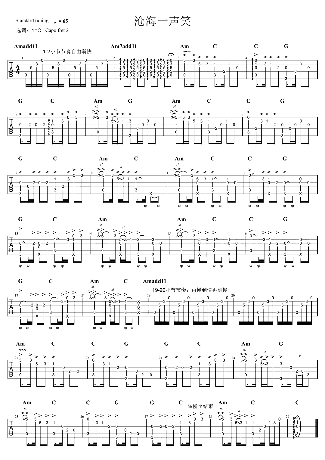 曲谱介绍: 沧海一声笑指弹吉他谱,改编自许冠杰演唱的歌曲,同时也是香港经典电影《笑傲江湖》主题曲,《沧海一声笑》独奏六线谱,选用C调指法编配的指弹,CAPO夹2品弹奏,速度控制在65拍每分钟,节奏拍号4/4,建议定要参考演示视频结合练习。 这首歌老归老,但有个神奇之处,只要前奏一起,不管什么境况的人,都能找到匹配的心境。沧海一笑,浮沉俗事也只是今朝,笑看从容于心好。 指弹谱详情