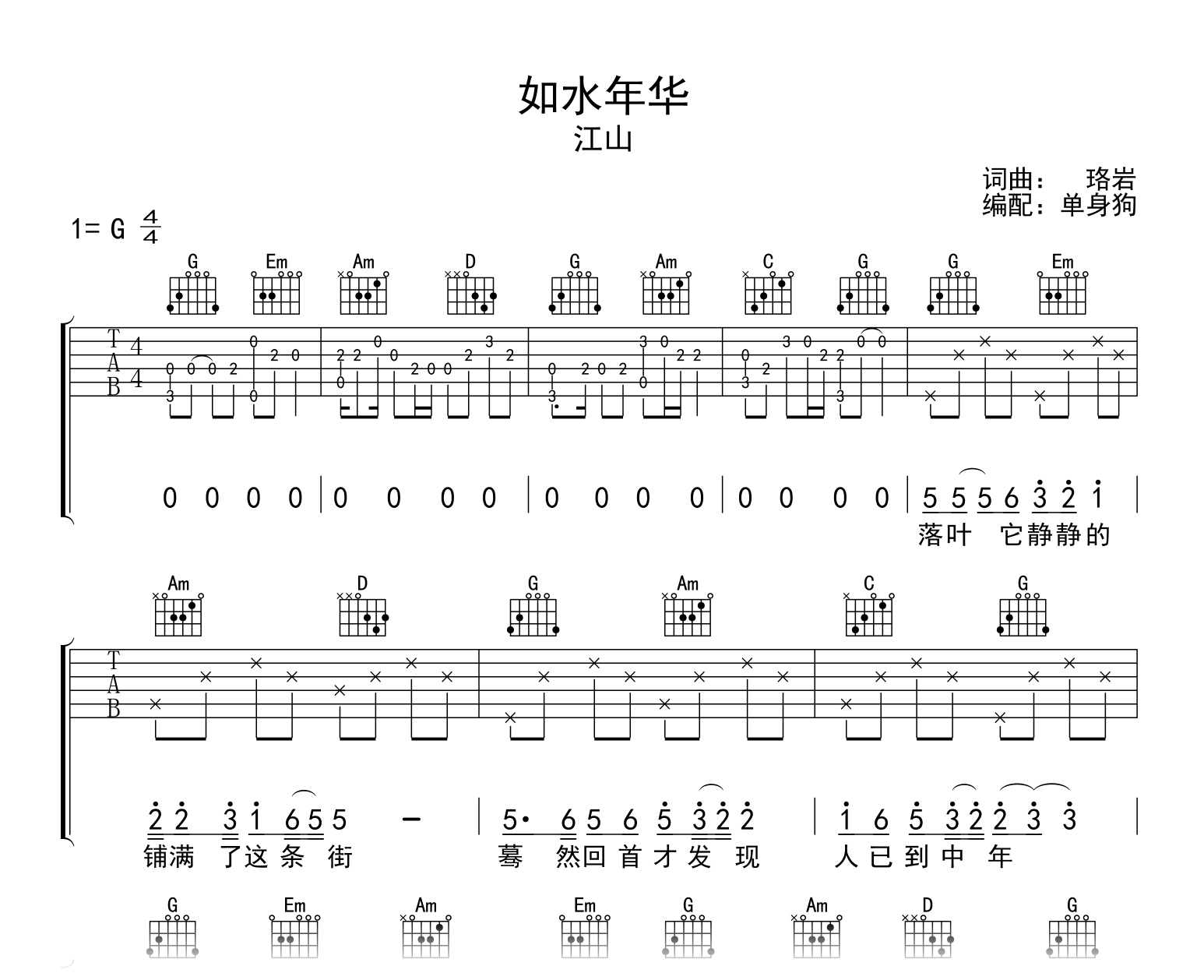 曲谱介绍: 如水年华吉他谱,江山演唱,年华似水,岁月如歌,一首经典网络歌曲。《如水年华》吉他弹唱谱,选用原调G调和弦指法编配,高清六线谱共三张谱例。 落叶它静静的铺满了这条街,蓦然回首才发现人已到中年,往日的一切仿佛都在昨天……红尘陌上,将斑斓的心事收藏进泛黄的昨日,让我们静静咀嚼岁月的甘美。