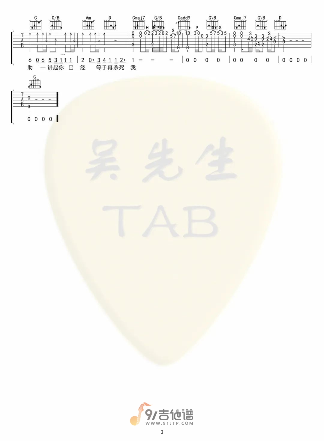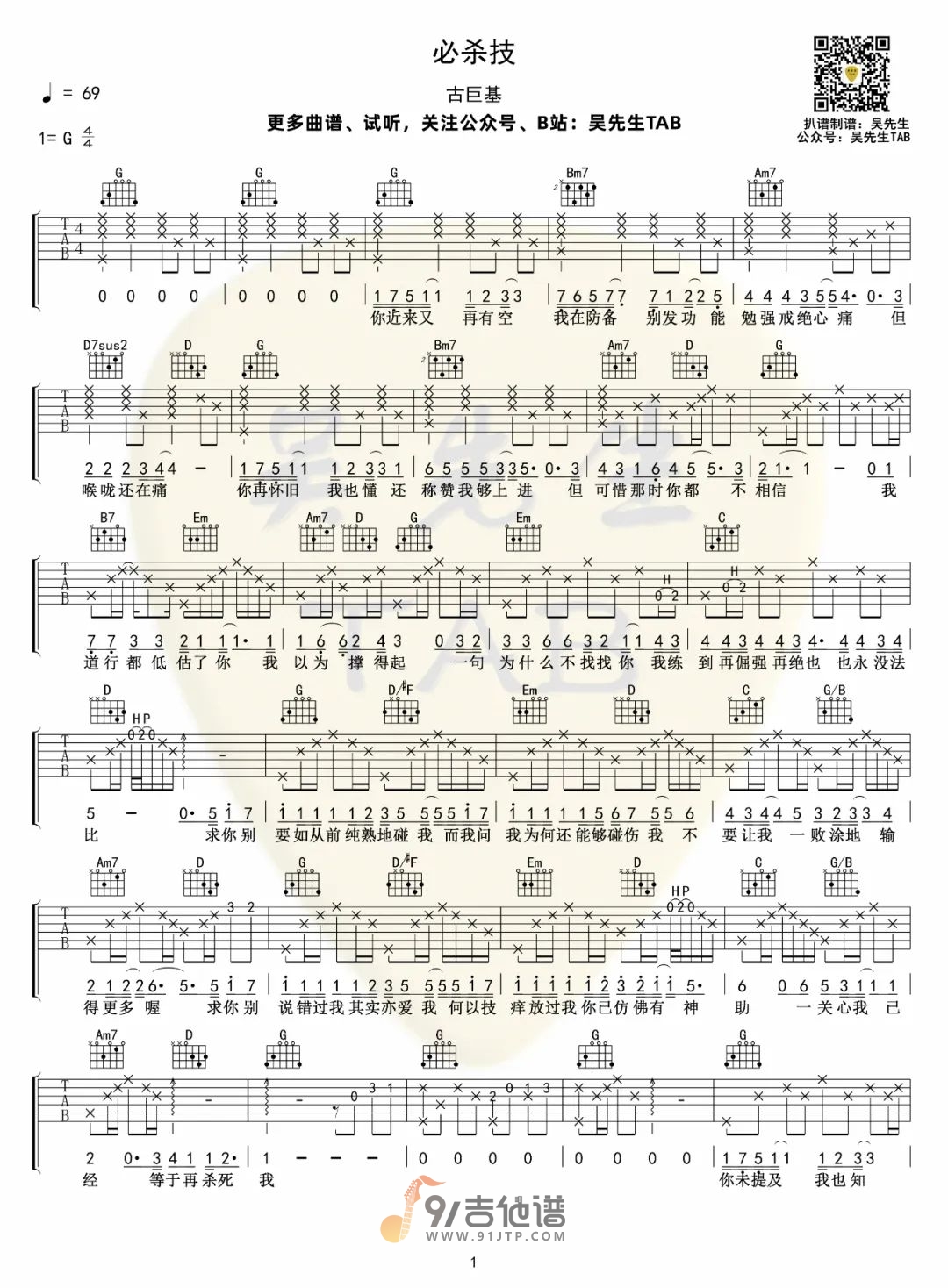 曲谱介绍: 曲谱简介:必杀技吉他谱,古巨基演唱的一首歌曲,4/4拍的节奏,这首歌曲的原调为G调,这里曲谱采用了G调指法进行编配,演唱时可不夹变调夹,曲谱由吴先生TAB编配出品。不要说错过了也还是爱我,不要以为我永远不会离开,不要仗着我的喜欢,再来让我一次次掉眼泪。你知道的,你手里始终攥着必杀技。