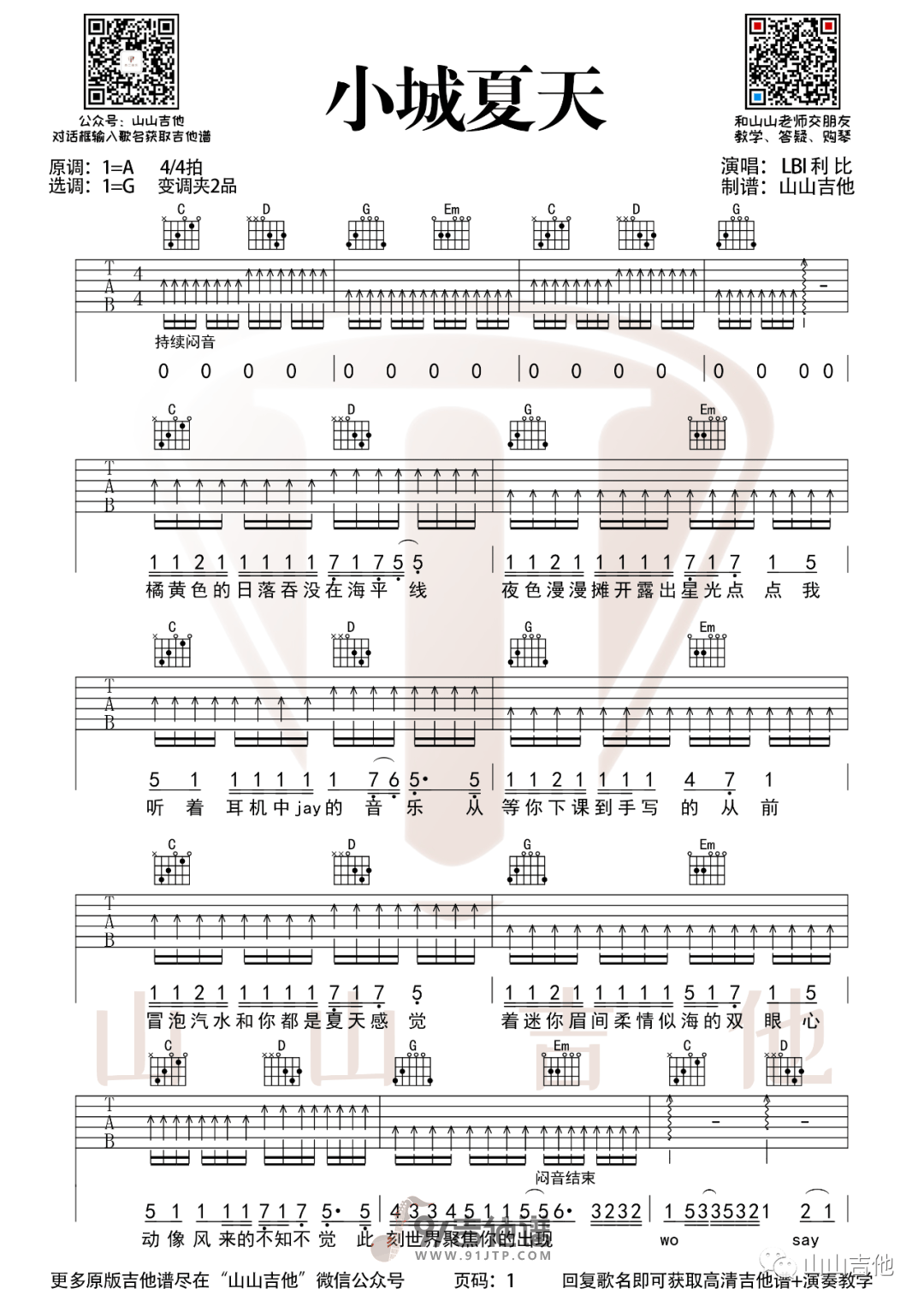 曲谱介绍: 曲谱简介:小城夏天吉他谱,LBI比利演唱的一首歌曲,4/4拍的节奏,这首歌曲的原调为A调,这里曲谱采用了G调指法进行编配,演唱时夹变调夹2品可回到原调,也可根据个人实际嗓音情况选择。曲谱由山山吉他编配出品。欢快的节奏搭配动感的歌词,再加上满大街都在洗脑式的循环播放,相信你一定会爱上这首歌。