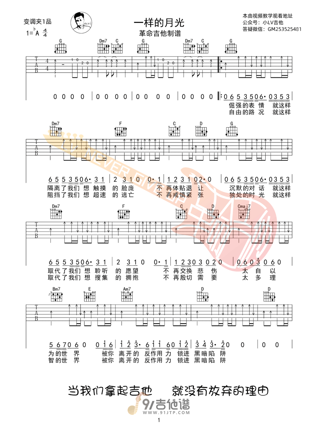 曲谱介绍: 曲谱简介:一样的月光吉他谱,徐佳莹演唱的一首歌曲,4/4拍的节奏,这首歌曲的原调为降A调,这里曲谱采用了G调指法进行编配,演唱时夹变调夹1品可回到原调,也可根据个人实际嗓音情况选择。曲谱由革命吉他编配出品。这是徐佳莹的第一首创作曲,用音乐纪念一段青春年少的爱情,以轻盈为基调,旋律丝毫不显生涩,重新编写的歌词更显示徐佳莹成熟精进的文字功力。