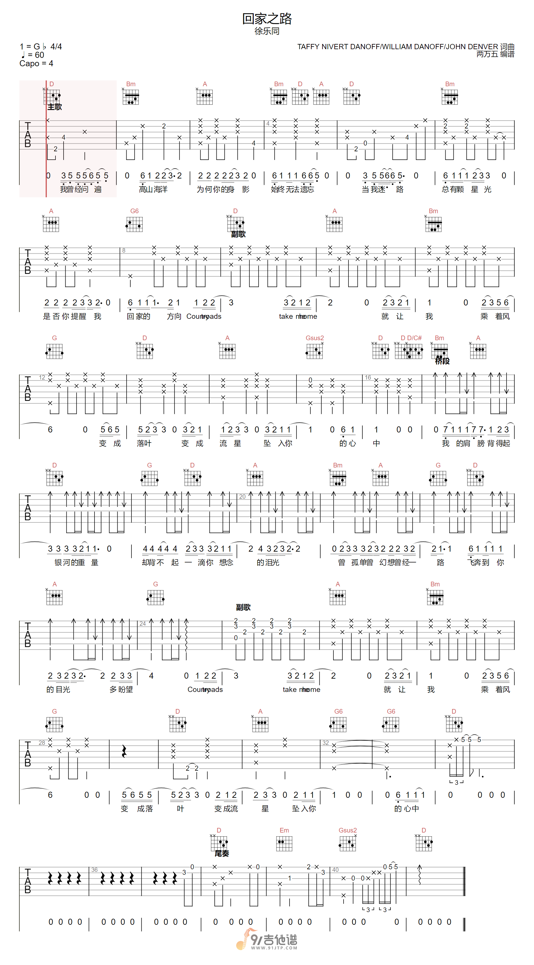 回家之路吉他谱 - 徐乐同 - D调吉他弹唱谱 - 原版