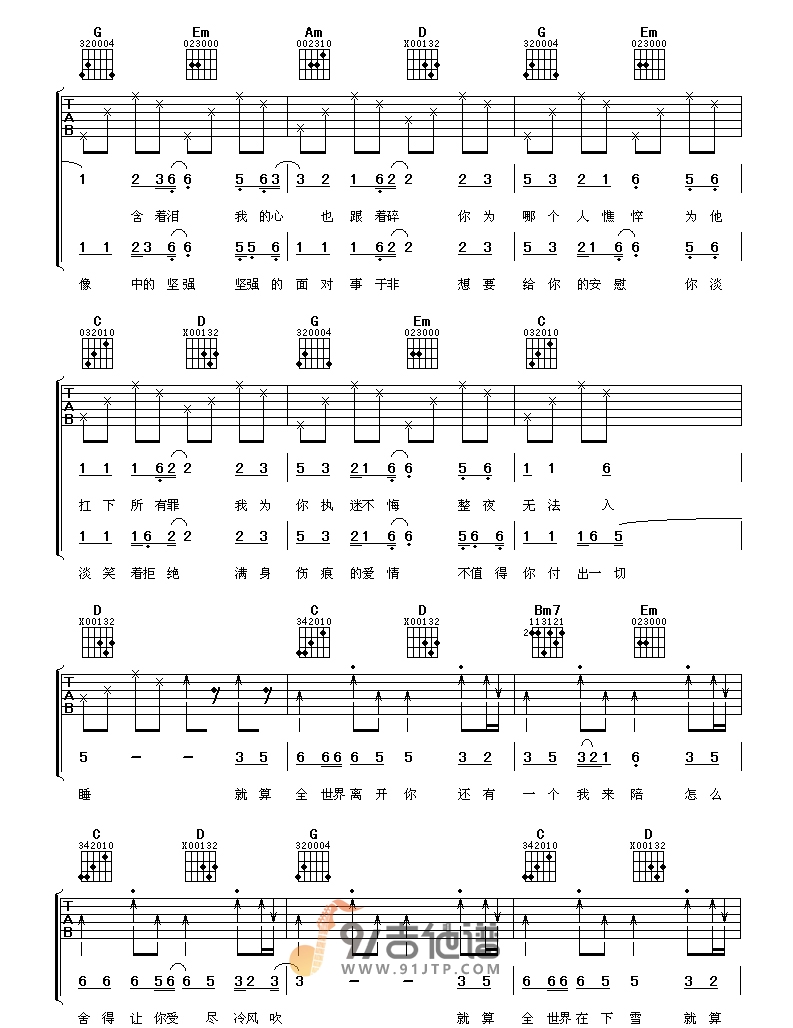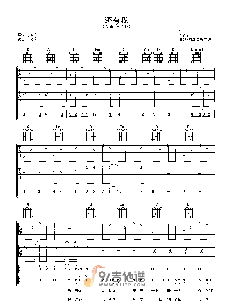 曲谱介绍: 曲谱简介:还有我吉他谱,任贤齐演唱的一首歌曲,4/4拍的节奏,这首歌曲的原调为G调,这里曲谱采用了G调指法进行编配,演唱时可不夹变调夹,曲谱由阿潘音乐工厂编配出品。这首歌是电影《合约情人》的插曲,任贤齐在《挑战主打歌》演唱的这首歌,打动了无数观众。