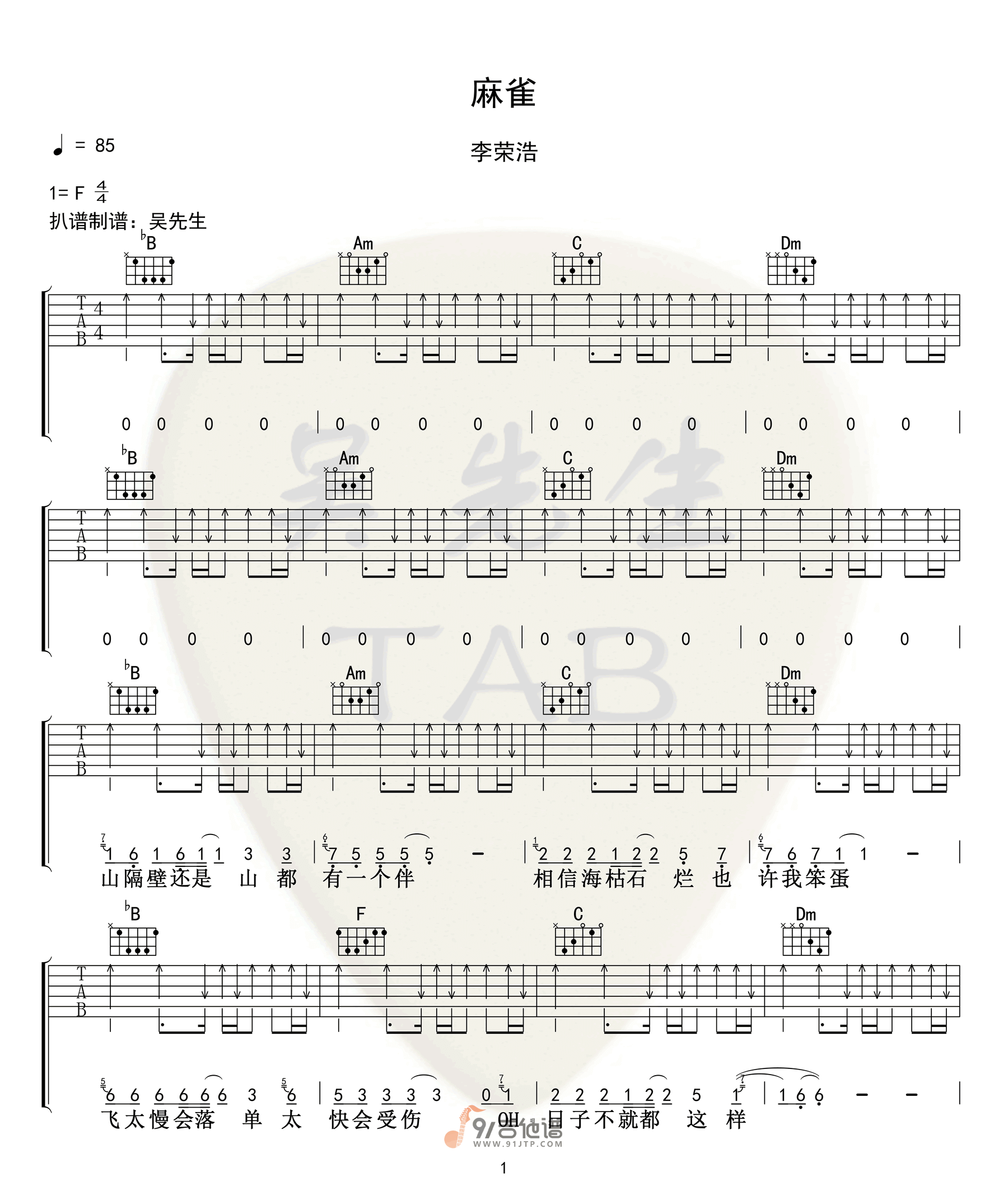 曲谱介绍: 曲谱简介:麻雀吉他谱,李荣浩演唱的一首歌曲,4/4拍的节奏,这首歌曲的原调为F调,这里曲谱采用了F调指法进行编配,演唱时可不夹变调夹,曲谱由吴先生TAB编配出品。这首歌旋律虽然土,但是编曲尤其是吉他很有味道,用有格调的编曲包装“大俗旋律”是李荣浩如今惯用的手法,这样的手法可以打破多圈层达到全民传唱的效果。