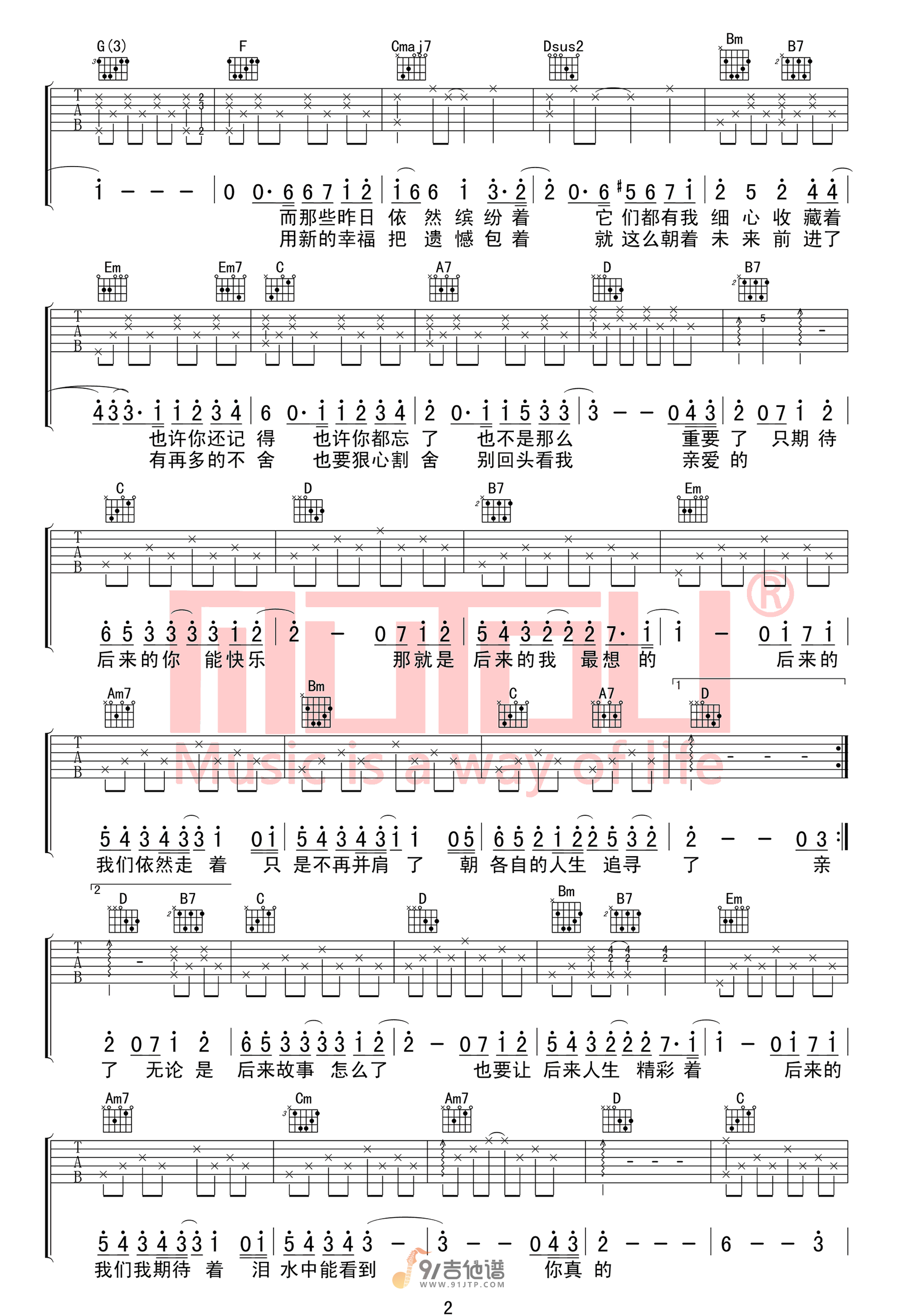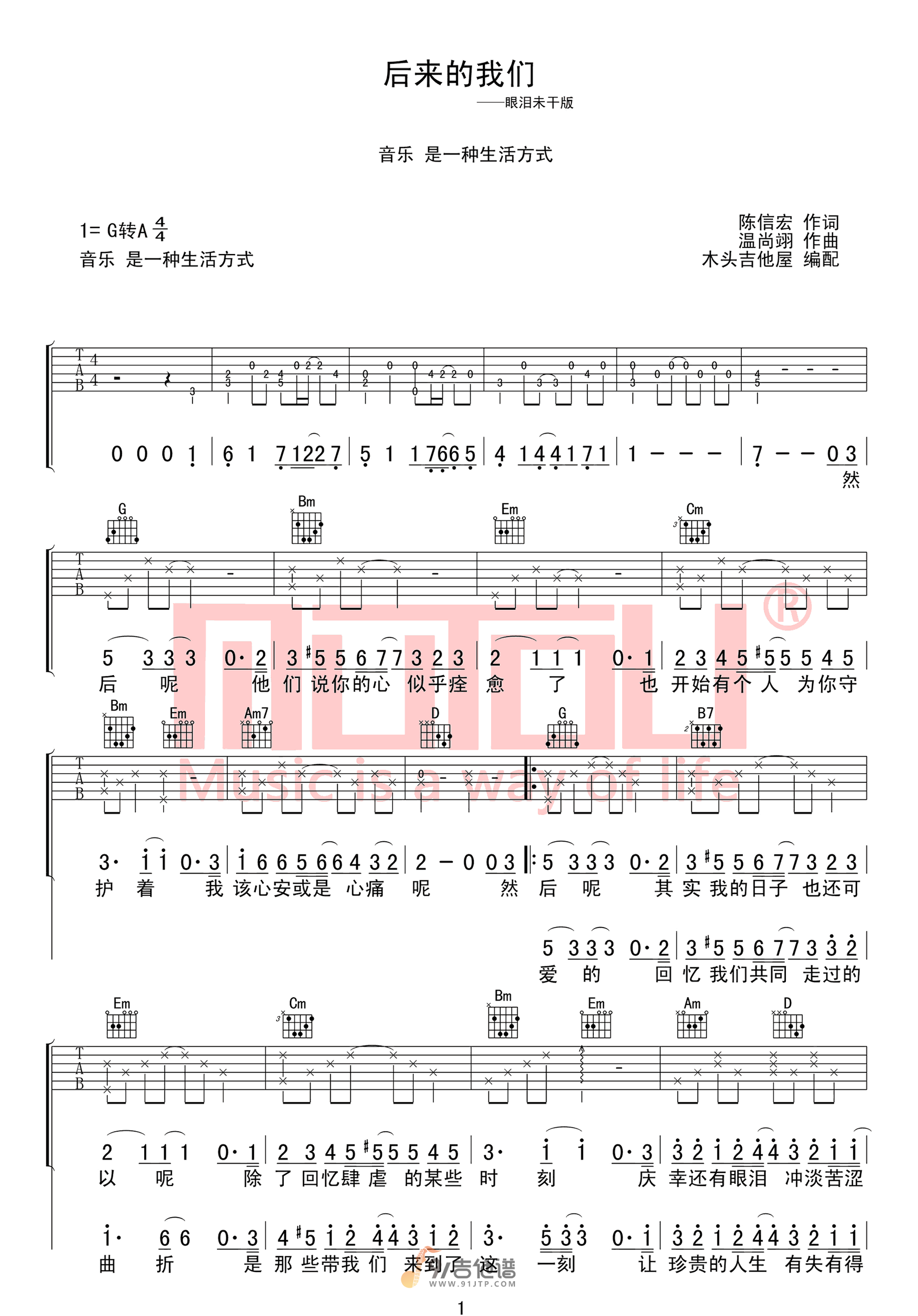 曲谱介绍: 曲谱简介:后来的我们吉他谱,五月天演唱的一首歌曲,4/4拍的节奏,这首歌曲的原调为G调,这里曲谱采用了G调指法进行编配,演唱时可不夹变调夹,曲谱由木头91吉他谱编配出品。这首歌延续了五月天一贯为人熟悉的情歌风格,曲调婉转上口、 歌词细致工整,与歌曲《突然好想你》和《我不愿让你一个人》共同组成了“虐情歌三部曲”。