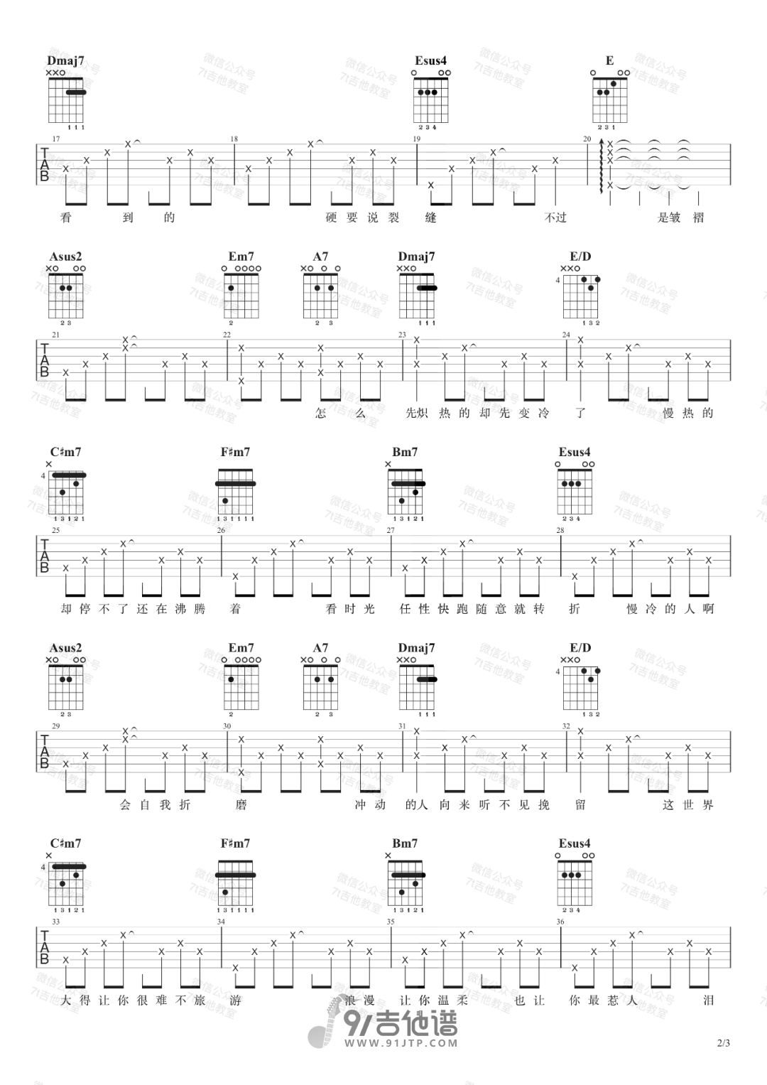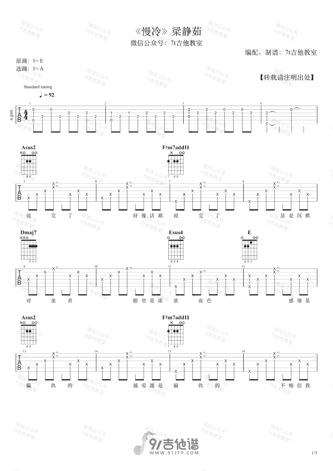 曲谱介绍: 曲谱简介:慢冷吉他谱,梁静茹演唱的一首歌曲,4/4拍的节奏,这首歌曲的原调为E调,这里曲谱采用了A调指法进行编配,演唱时可根据个人情况选择变调夹,曲谱由7T吉他教室编配出品。