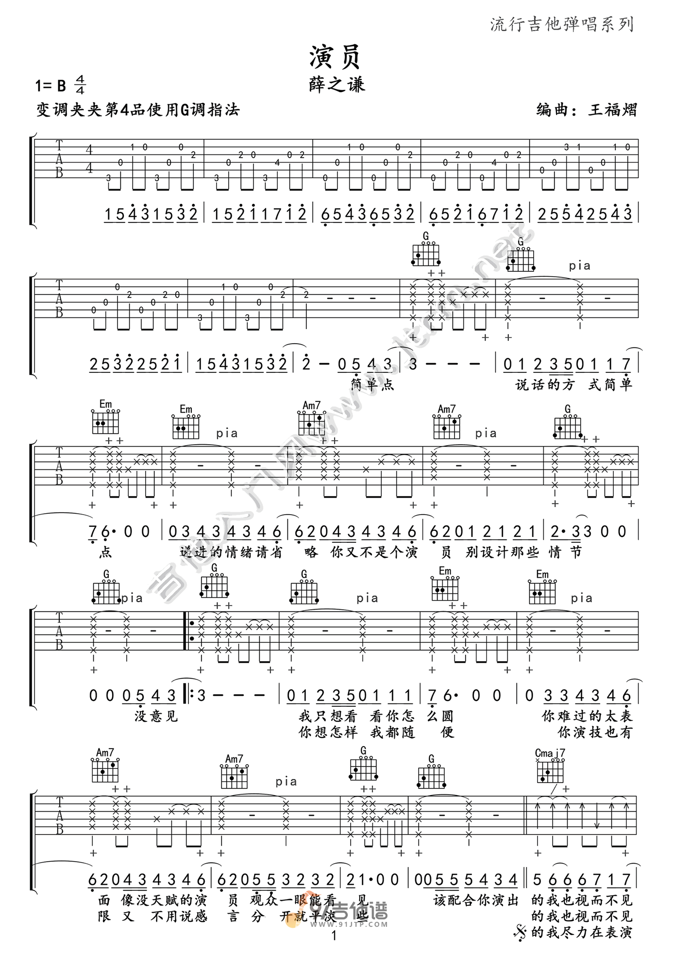 曲谱介绍: 曲谱简介:演员吉他谱,薛之谦演唱的一首歌曲,4/4拍的节奏,这首歌曲的原调为B调,这里曲谱采用了G调指法进行编配,演唱时夹变调夹4品可回到原调,也可根据个人实际嗓音情况选择。曲谱由福艺吉他编配出品。这首歌以平白的文字续写深情伤感,歌词以男生的视角对女生倾诉:既然不再爱了,就要坦荡的表达。延续以往悲伤情歌路线,薛之谦再一次用歌曲诠释出爱恨纠葛的爱情寓言。
