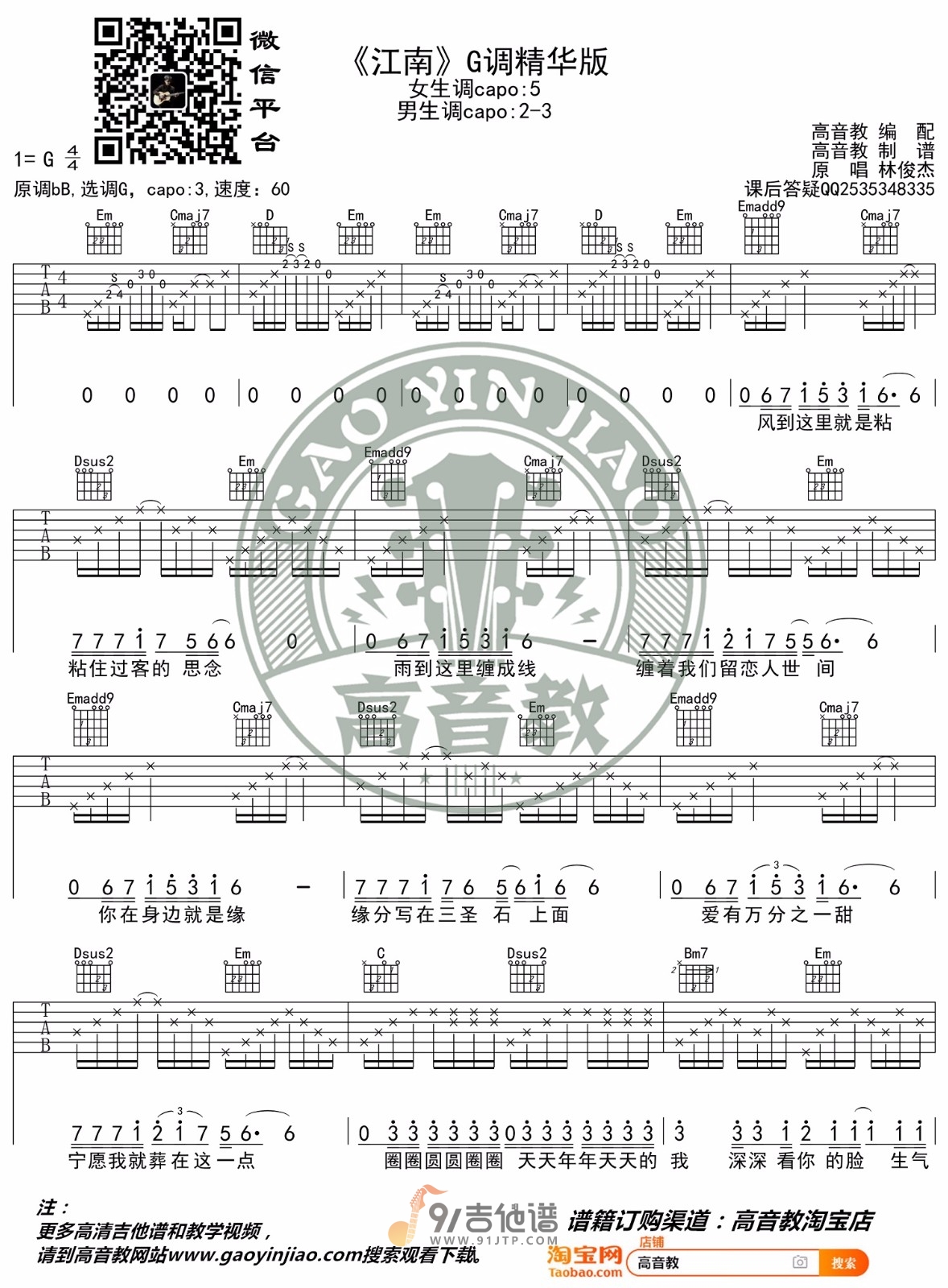 曲谱介绍: 曲谱简介:江南吉他谱,林俊杰演唱的一首歌曲,4/4拍的节奏,这首歌曲的原调为降B调,这里曲谱采用了G调指法进行编配,演唱时夹变调夹3品可回到原调,也可根据个人实际嗓音情况选择。曲谱由高音教编配出品。这首歌是林俊杰刚出道时的成名曲了,一首很有中国风味道的歌曲,曾一度不被看好,但结果已经说明了一切。