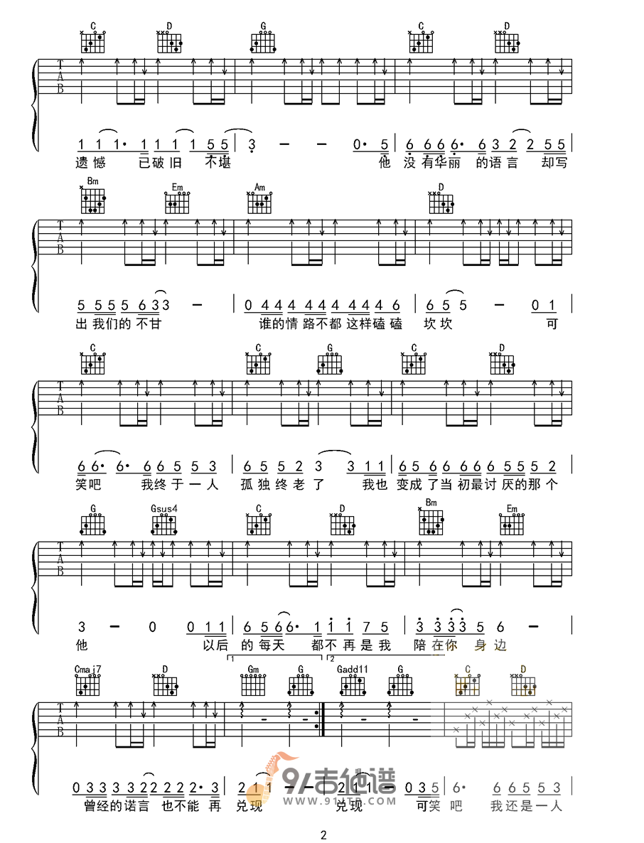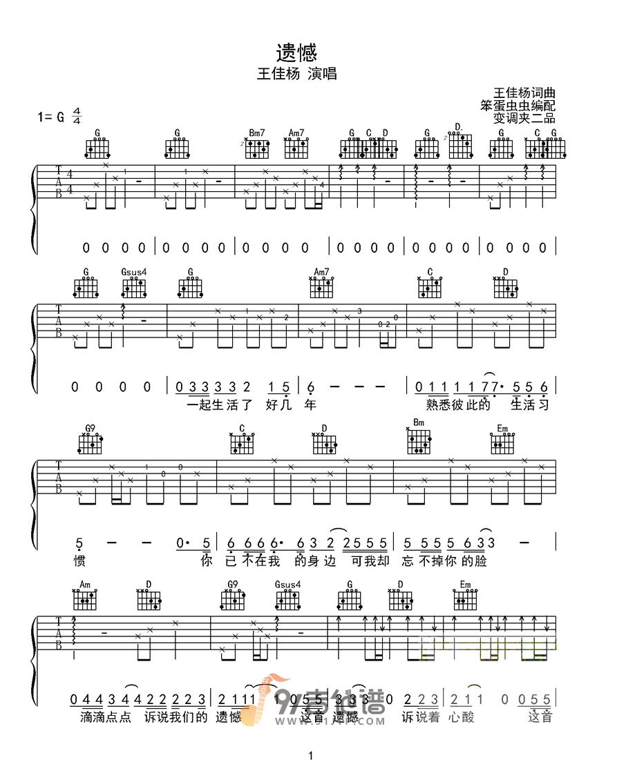曲谱介绍: 曲谱简介:遗憾吉他谱,王佳杨演唱的一首歌曲,4/4拍的节奏,这首歌曲的原调为G调,这里曲谱采用了G调指法进行编配,演唱时可不夹变调夹,曲谱由笨蛋虫虫编配出品。一起生活了好几年,熟悉彼此的生活习惯,你已不在我的身边,可我却忘不掉你的脸,滴滴点点诉说我们的遗憾。