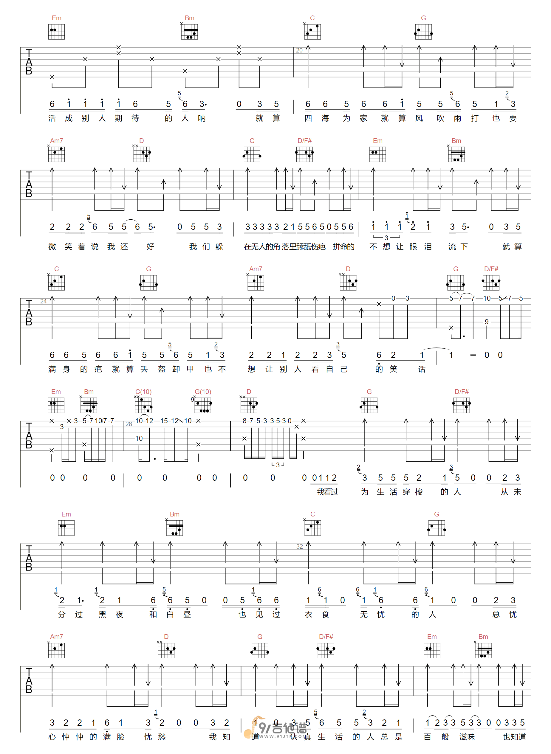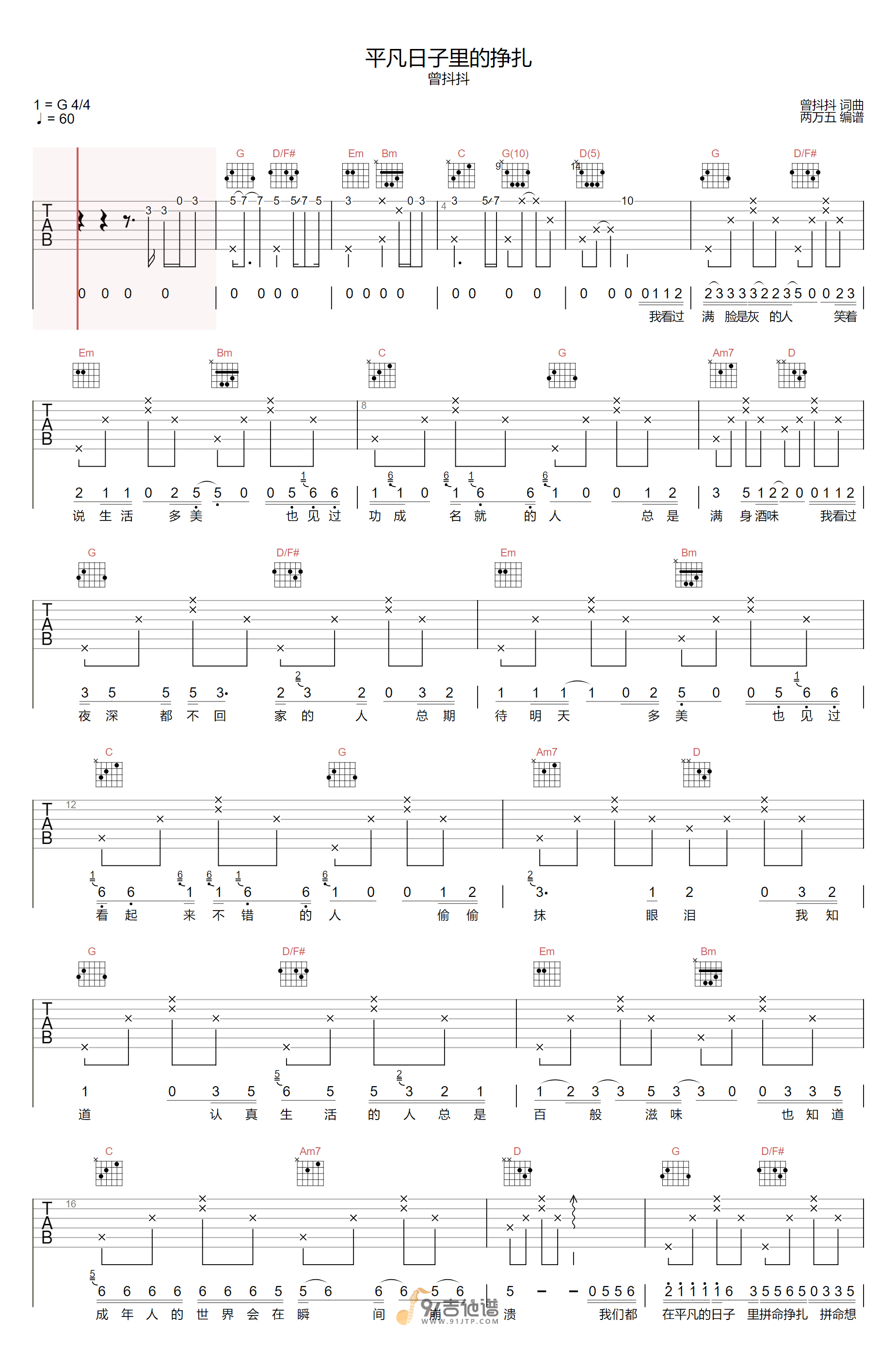 曲谱介绍: 曲谱简介:平凡日子里的挣扎吉他谱,曾抖抖演唱的一首歌曲,4/4拍的节奏,这首歌曲的原调为G调,这里曲谱采用了G调指法进行编配,演唱时可不夹变调夹,曲谱由两万五编配出品。这首歌曲给人一种伤感的感觉,但是又很励志的那种。这首歌曲的韵律,歌词,歌调,好像特别适合在拼搏道路上的年轻人,还有那些正在拼命挣扎的创业人。