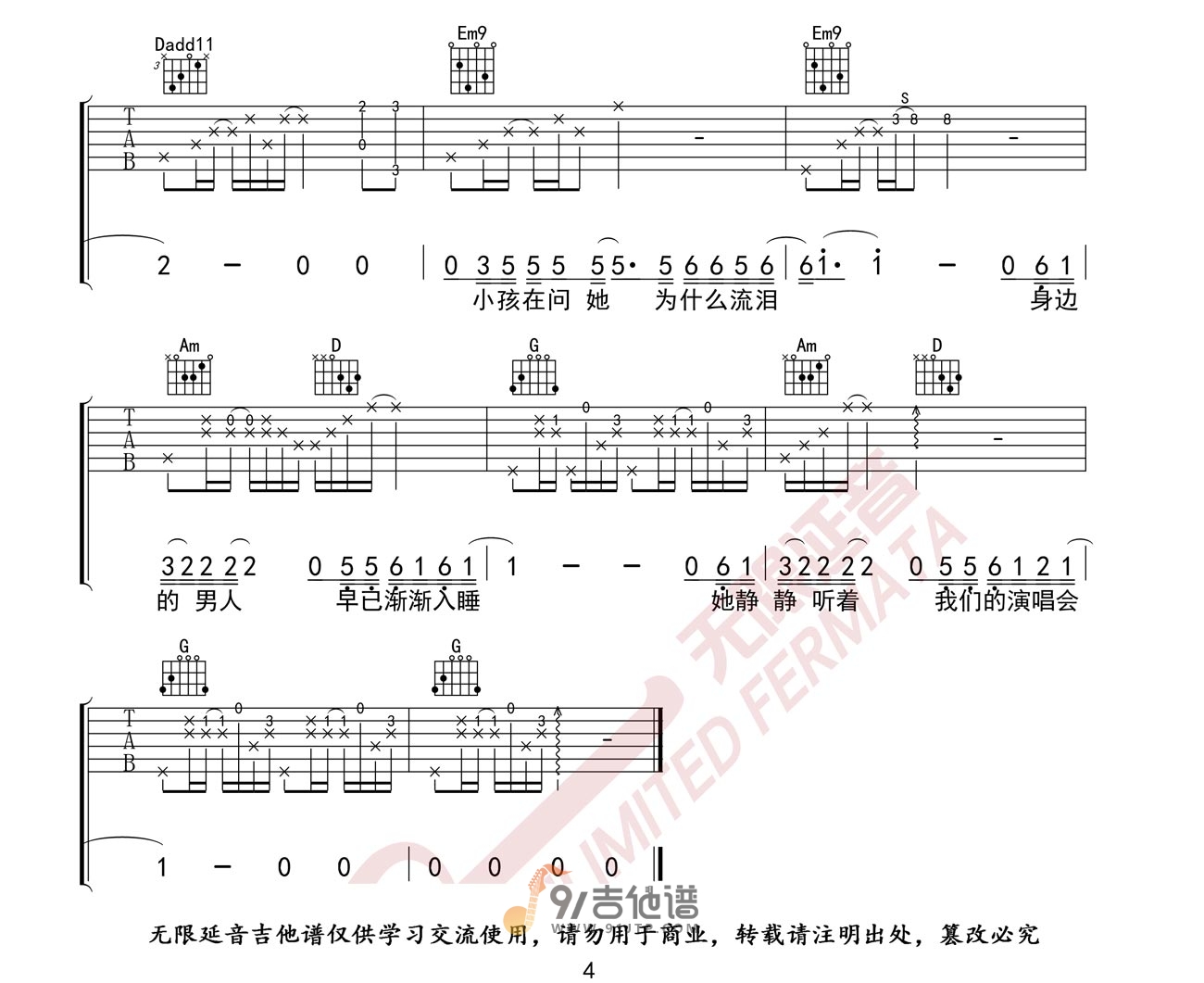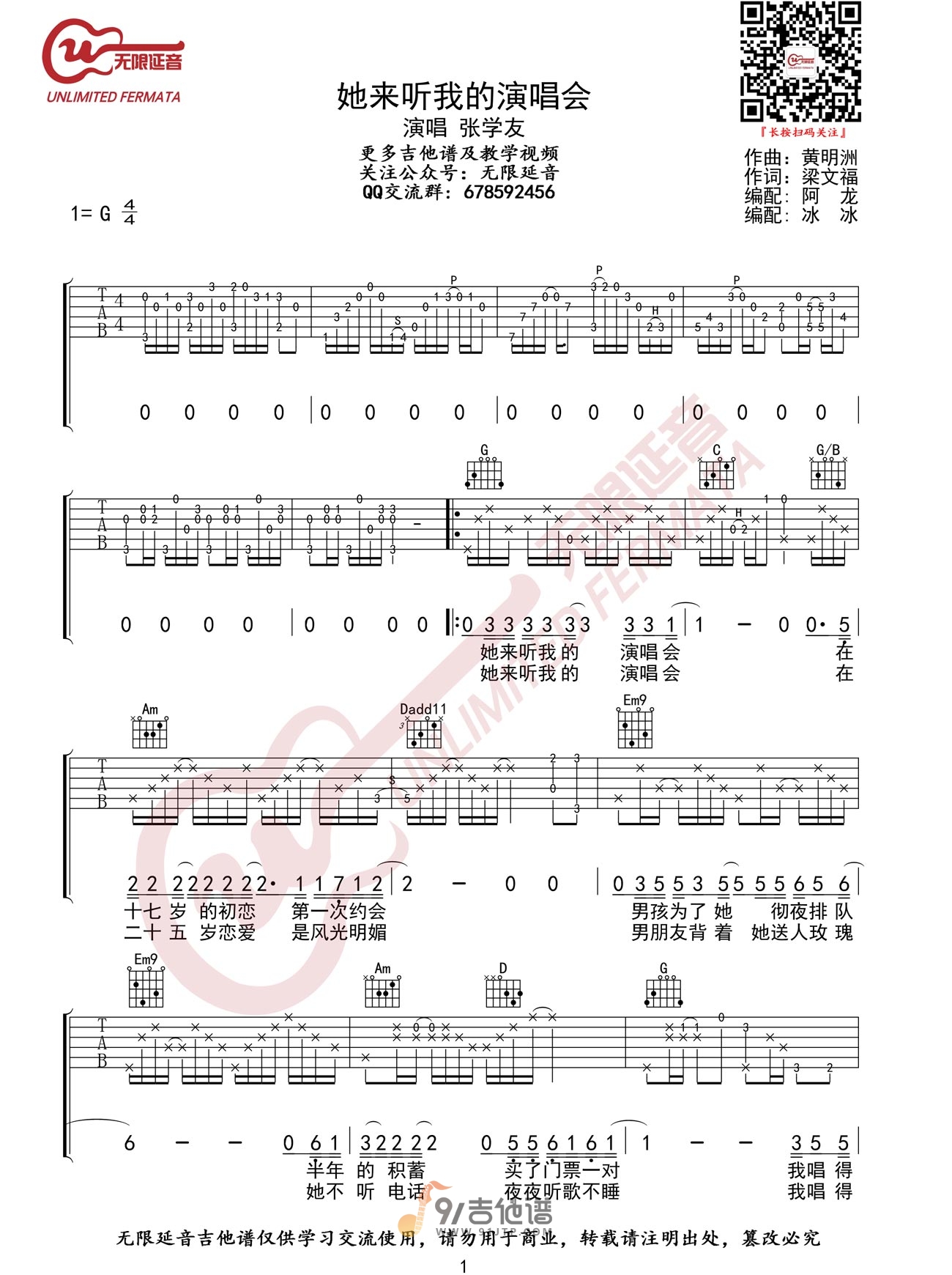 曲谱介绍: 曲谱简介:她来听我的演唱会吉他谱,张学友演唱的一首歌曲,4/4拍的节奏,这首歌曲的原调为G调,这里曲谱采用了G调指法进行编配,演唱时可不夹变调夹,曲谱由无限延音编配出品。这是歌神张学友早期演唱的一首经典老情歌,歌中的故事很动人,旋律也很优美,让人欲罢不能,经常单曲循环。