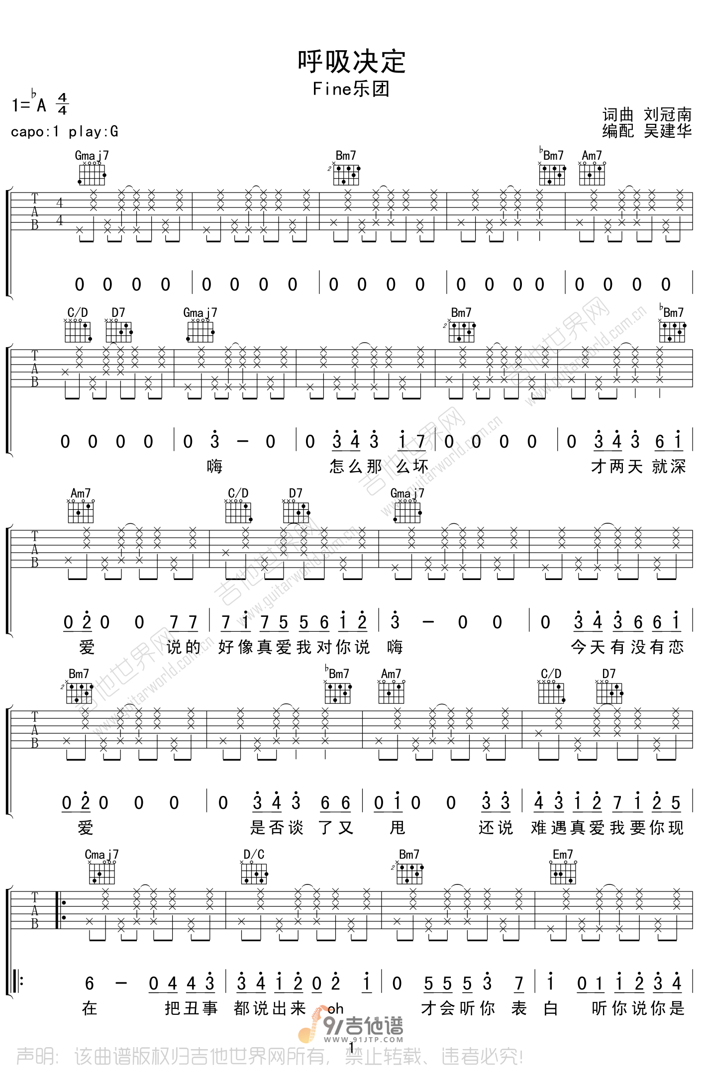 呼吸决定吉他谱 - Fine乐团 - G调吉他弹唱谱 - 原版
