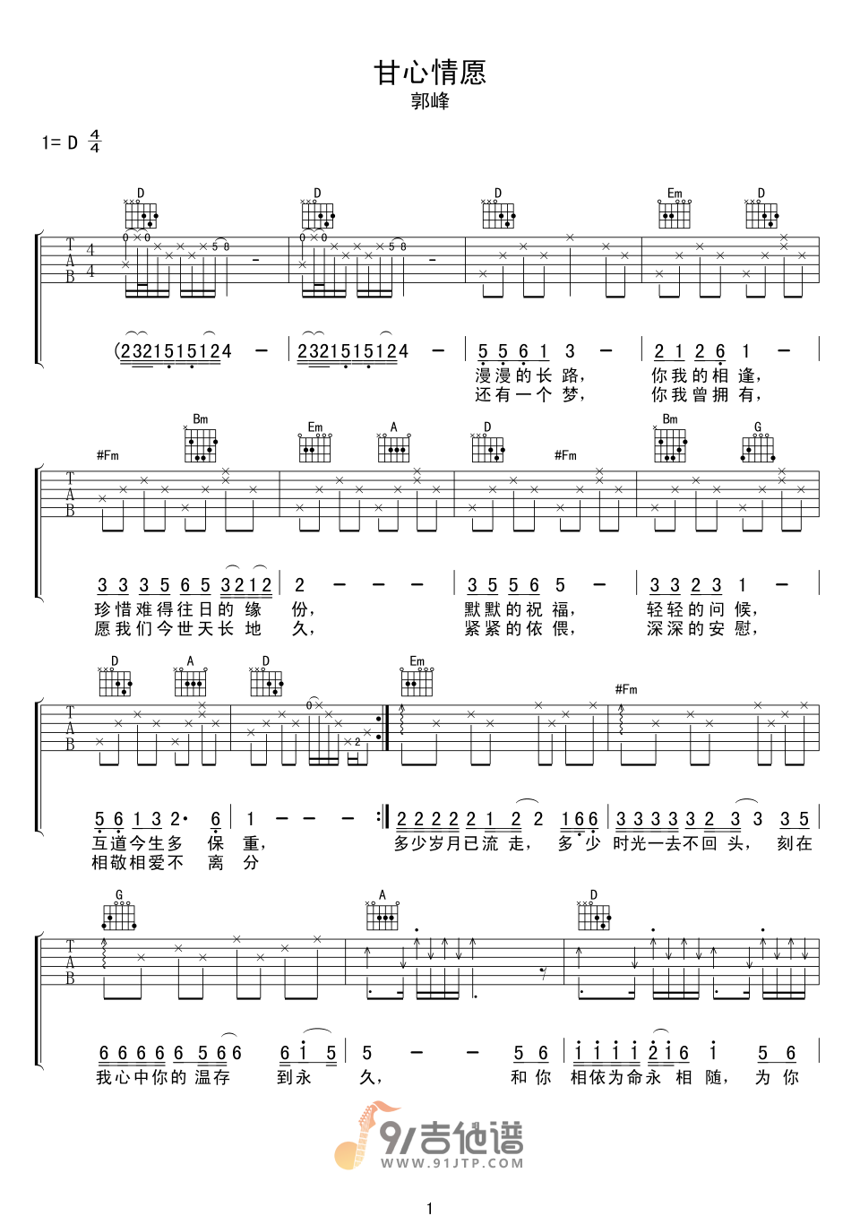 甘心情愿吉他谱 - 郭峰 - D调吉他弹唱谱 - 原版