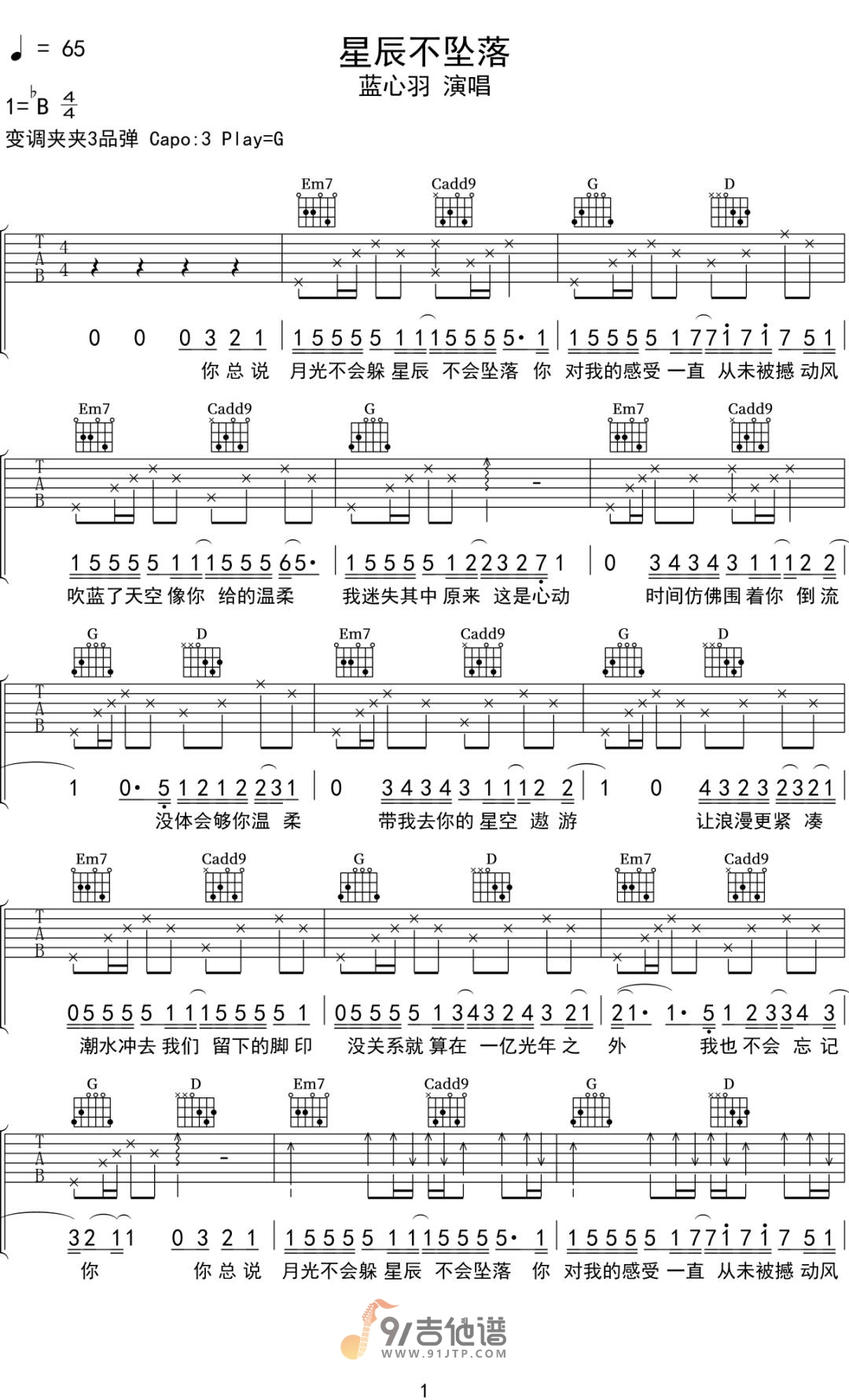 曲谱介绍: 曲谱简介:星辰不坠落吉他谱,蓝心羽演唱的一首歌曲,4/4拍的节奏,这首歌曲的原调为降B调,这里曲谱采用了G调指法进行编配,演唱时夹变调夹3品可回到原调,也可根据个人实际嗓音情况选择。曲谱由琴谱网更新上传,共3张高清图片弹唱吉他谱例,曲谱来源于网络转载,编配制谱者暂不详。