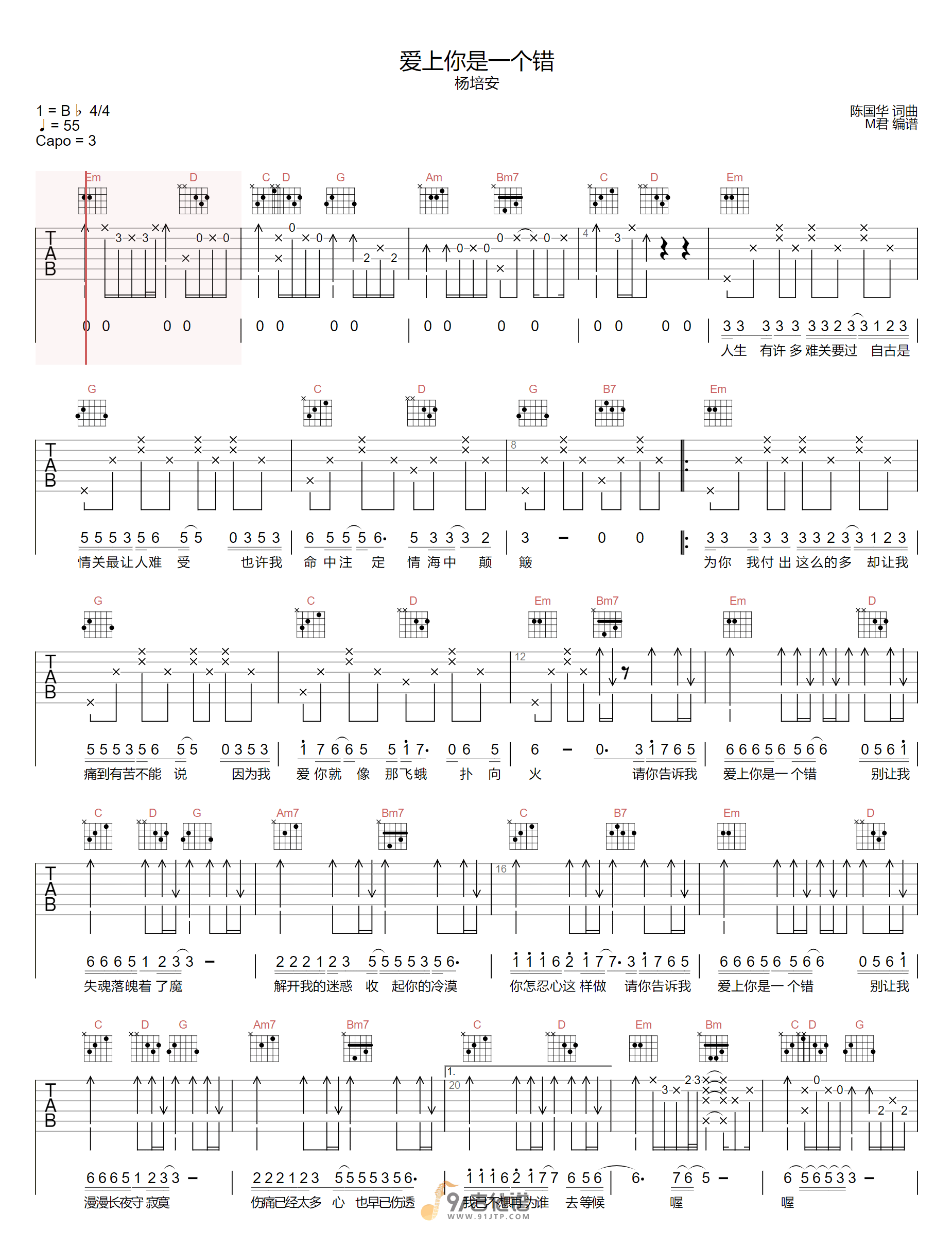 曲谱介绍: 曲谱简介:爱上你是一个错吉他谱,杨培安演唱的一首歌曲,4/4拍的节奏,这首歌曲的原调为降B调,这里曲谱采用了G调指法进行编配,演唱时夹变调夹3品可回到原调,也可根据个人实际嗓音情况选择。曲谱由M君编配出品。这首歌是一首最典型的华语流行歌曲。直白的歌名直指心底,通俗的歌词触动人心,琅琅上口的旋律抓人耳朵,够清楚、够简单。