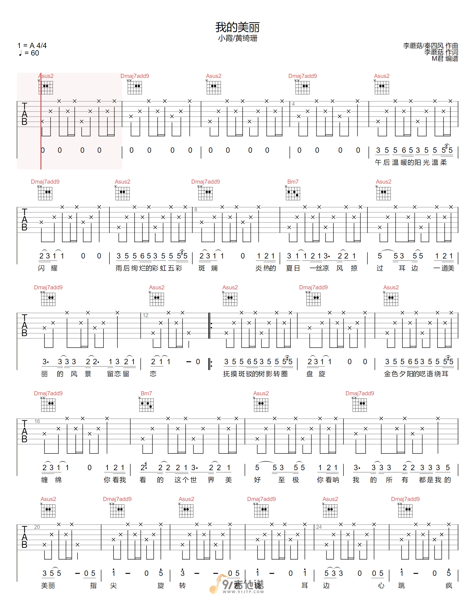 曲谱介绍: 曲谱简介:我的美丽吉他谱,黄绮珊演唱的一首歌曲,4/4拍的节奏,这首歌曲的原调为A调,这里曲谱采用了A调指法进行编配,演唱时可不夹变调夹,曲谱由M君编配出品。