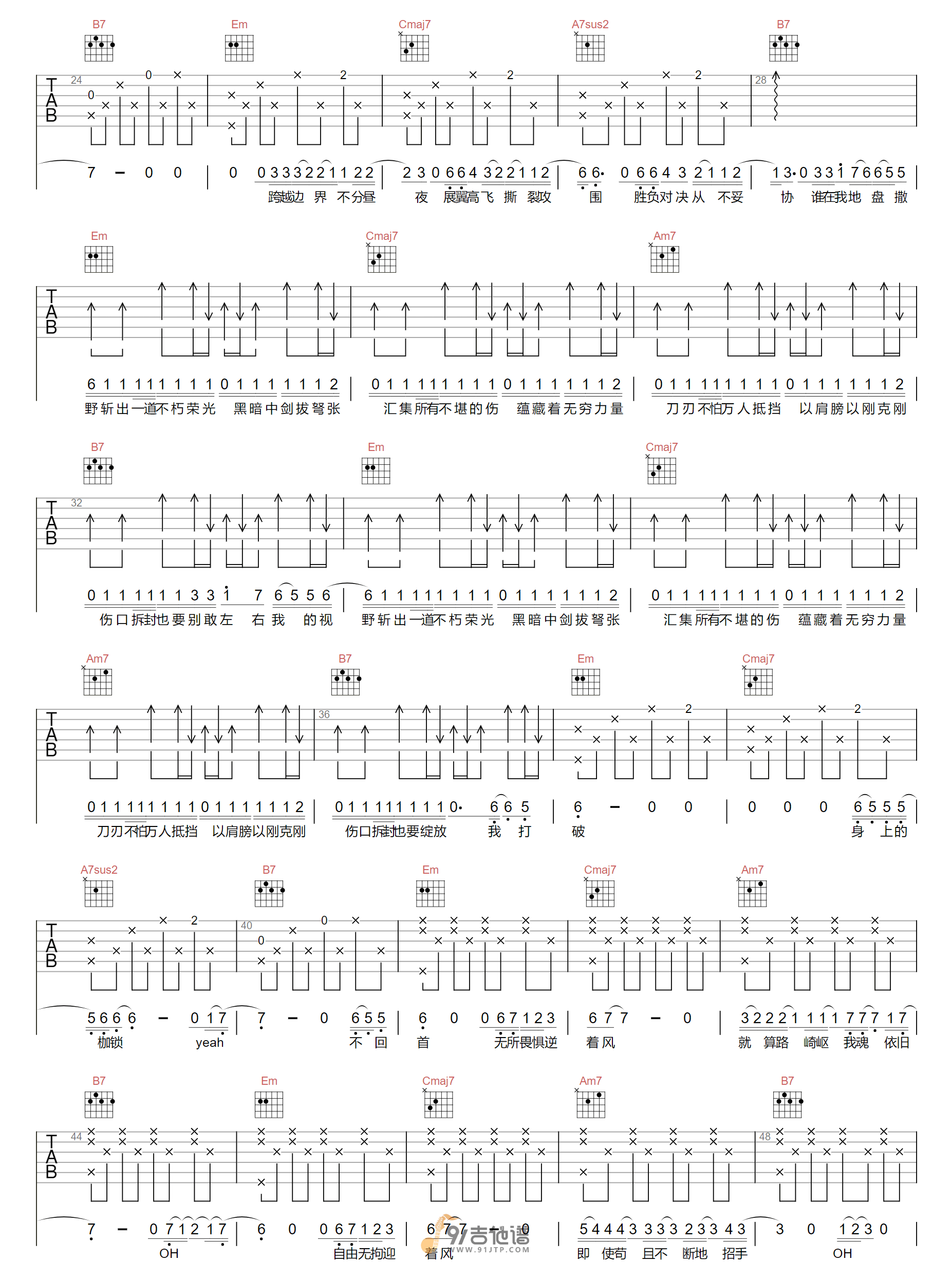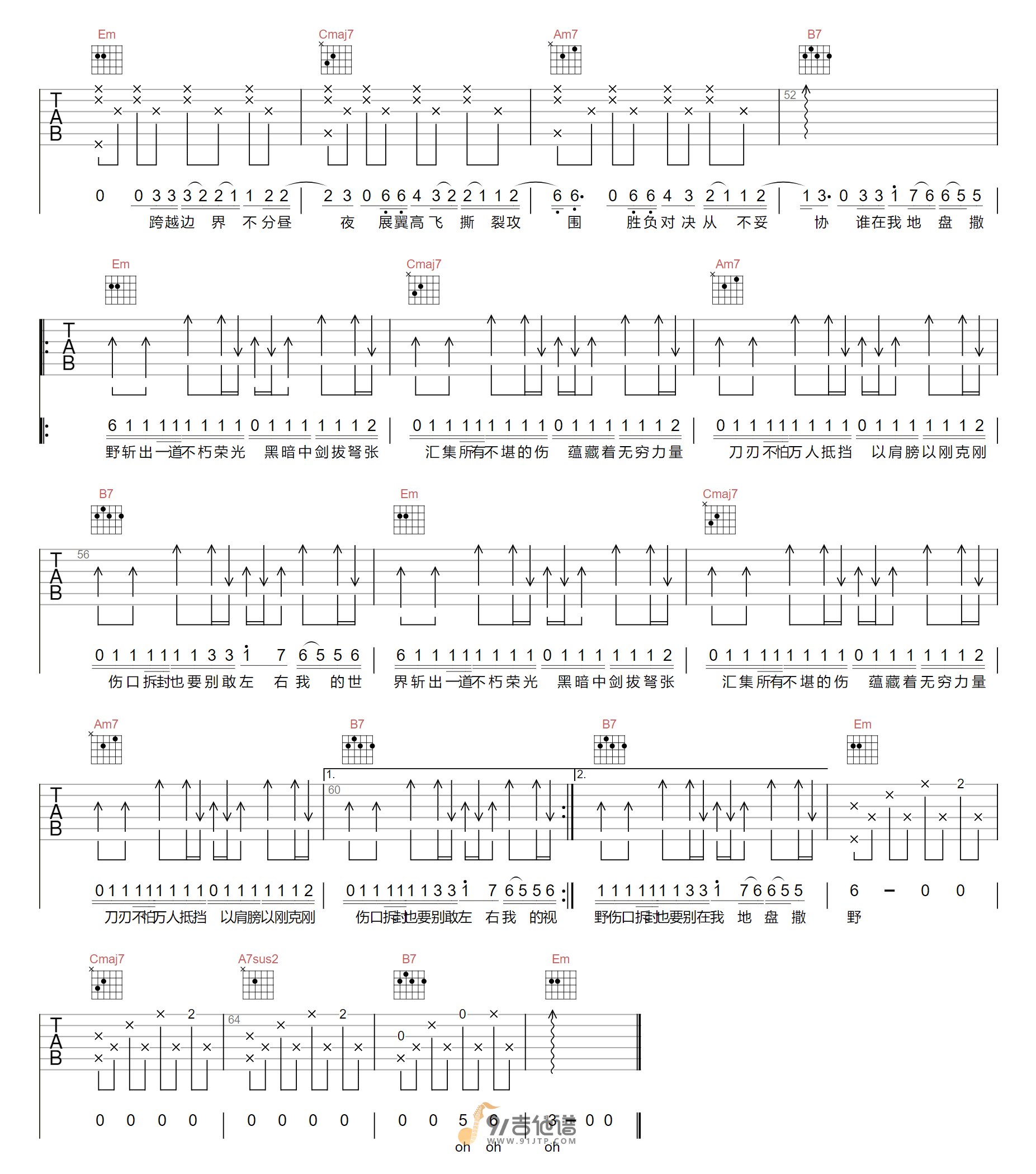 曲谱介绍: 曲谱简介:无拘吉他谱,林俊杰演唱的一首歌曲,4/4拍的节奏,这首歌曲的原调为C调,这里曲谱采用了G调指法进行编配,演唱时夹变调夹5品可回到原调,也可根据个人实际嗓音情况选择。曲谱由浪淘沙编配出品。这首歌是林俊杰为游戏「永劫无间」打造的一周年推广曲,歌曲名字正对应了游戏“我身无拘,吾道无穷”的核心理念,不管是激昂的节奏,还是扣入人心的填词,都跟游戏十分契合。