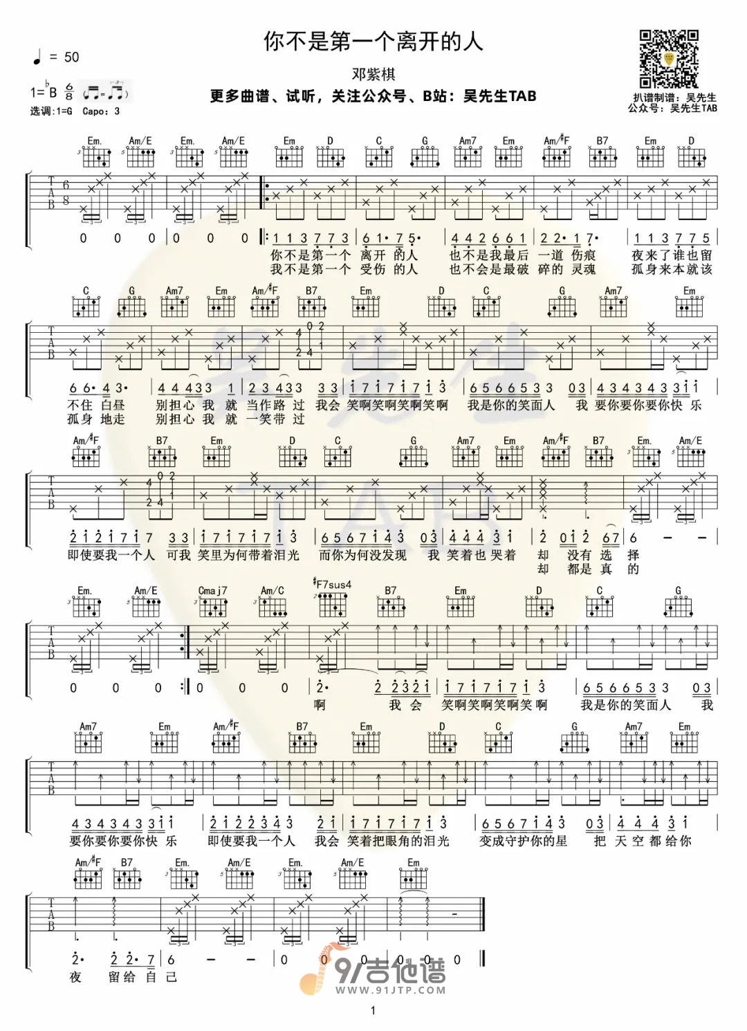 曲谱介绍: 曲谱简介:你不是第一个离开的人吉他谱,邓紫棋演唱的一首歌曲,6/8拍的节奏,这首歌曲的原调为降B调,这里曲谱采用了G调指法进行编配,演唱时夹变调夹3品可回到原调,也可根据个人实际嗓音情况选择。曲谱由吴先生TAB编配出品。