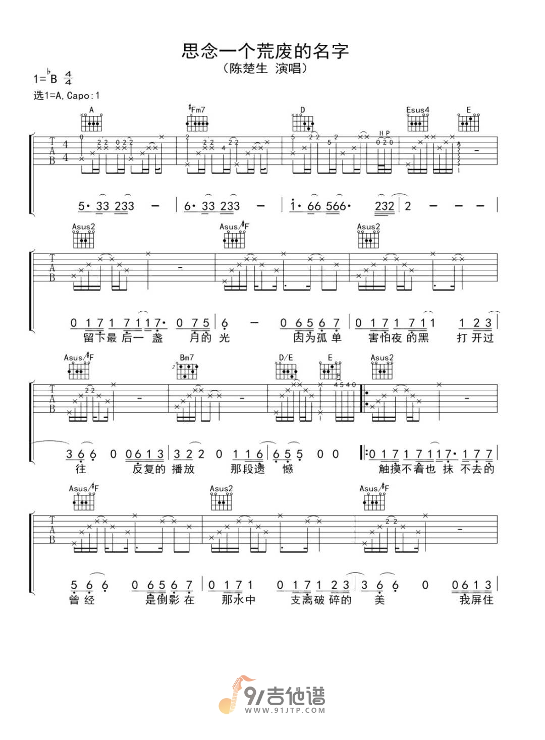 思念一个荒废的名字吉他谱 - 陈楚生 - A调吉他弹唱谱 - 原版