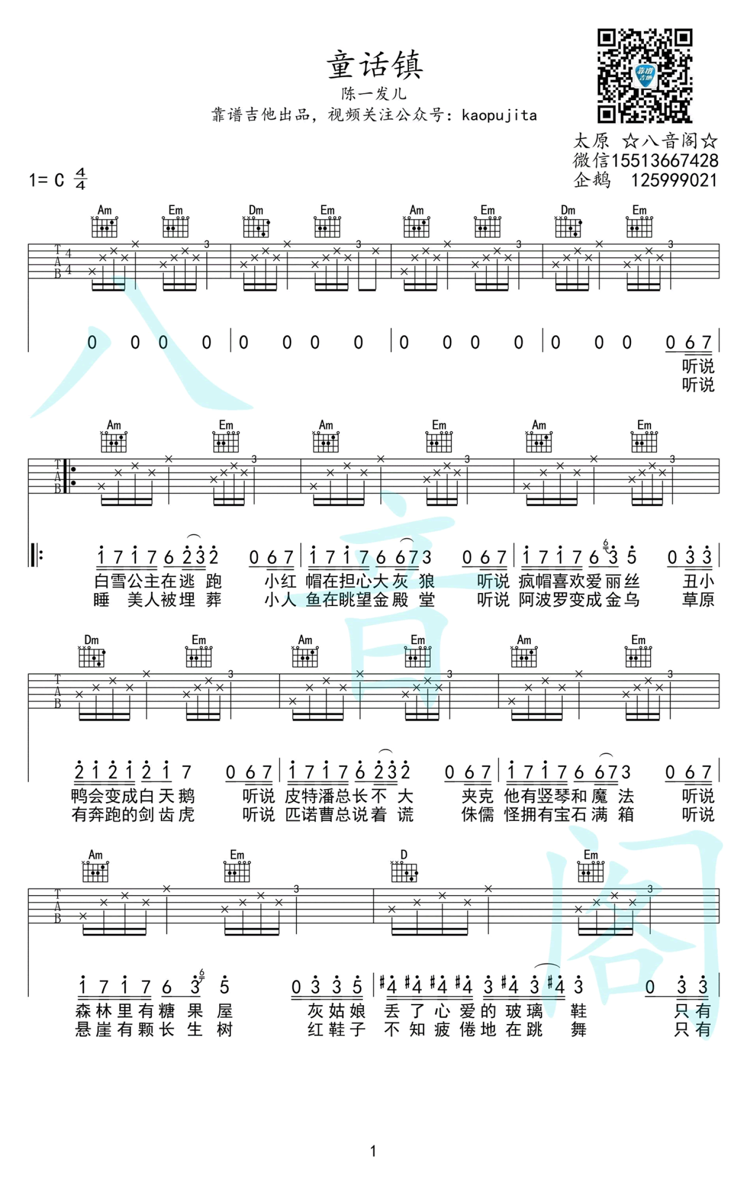 曲谱介绍: 陈一发儿《童话镇》吉他谱,C调弹唱谱,童话的美那般永恒和唯美,爱童话故事爱童话中那如画如花般的人儿,望生活如童话般纯净和淡雅芬芳。
