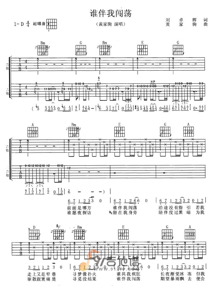 曲谱介绍: 曲谱简介:谁伴我闯荡吉他谱,Beyond演唱的一首歌曲,4/4拍的节奏,这首歌曲的原调为D调,这里曲谱采用了D调指法进行编配,演唱时可不夹变调夹,曲谱由琴谱网更新上传,共3张高清图片弹唱吉他谱例,曲谱来源于网络转载,编配制谱者暂不详。