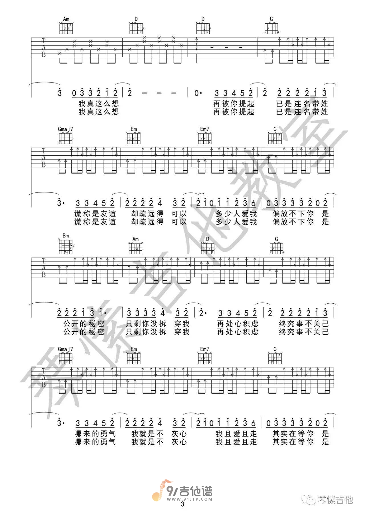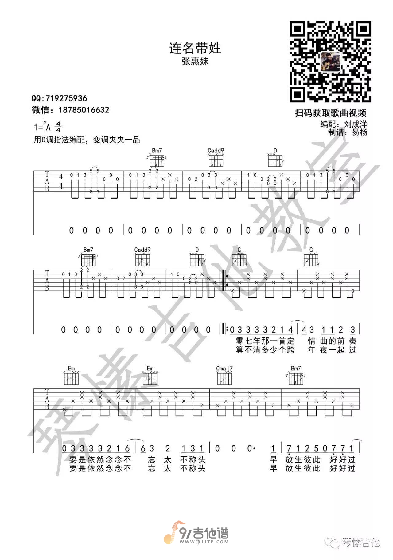 曲谱介绍: 曲谱简介:连名带姓吉他谱,张惠妹演唱的一首歌曲,4/4拍的节奏,这首歌曲的原调为降A调,这里曲谱采用了G调指法进行编配,演唱时夹变调夹1品可回到原调,也可根据个人实际嗓音情况选择。曲谱由琴愫吉他教室编配出品。这首歌唱出了每个人的爱情经历,撩拨着听众心里难忘的思念。该曲一开始,由寂寥沉静的钢琴悠扬开场,彷佛揭开了听众内心那段温热的感情,搭配张惠妹浓烈真切的演唱,把难以忘怀的情感描绘得深刻。