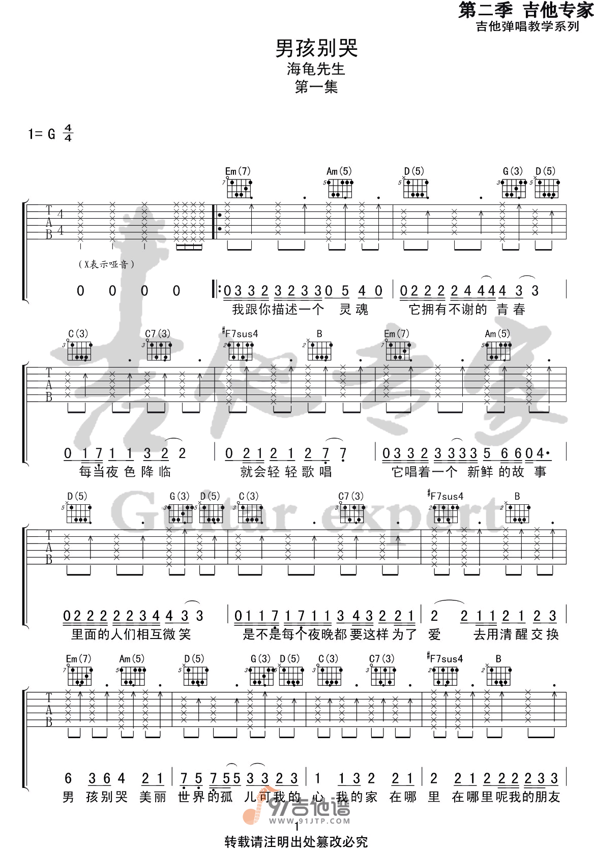 男孩别哭吉他谱 - 海龟先生 - G调吉他弹唱谱 - 原版