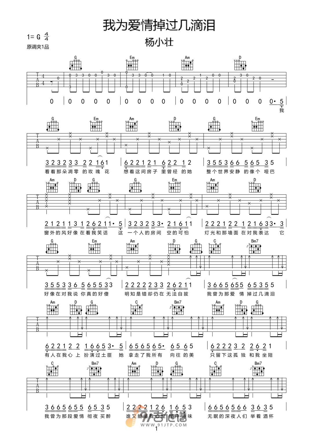 我为爱情掉过几滴泪吉他谱 - 杨小壮 - G调吉他弹唱谱 - 原版