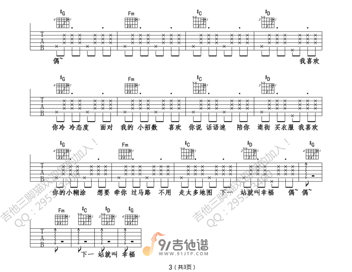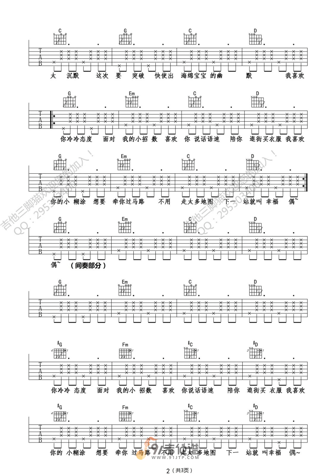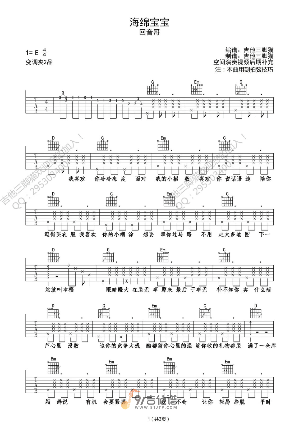 曲谱介绍: 曲谱简介:海绵宝宝吉他谱,回音哥演唱的一首歌曲,4/4拍的节奏,这首歌曲的原调为A调,这里曲谱采用了G调指法进行编配,演唱时夹变调夹2品可回到原调,也可根据个人实际嗓音情况选择。曲谱由吉他三脚猫编配出品。我喜欢你冷冷态度,面对我的小招数,喜欢你说话语速,陪你逛街买衣服......来自回音哥演唱的一首非常甜蜜的情歌。