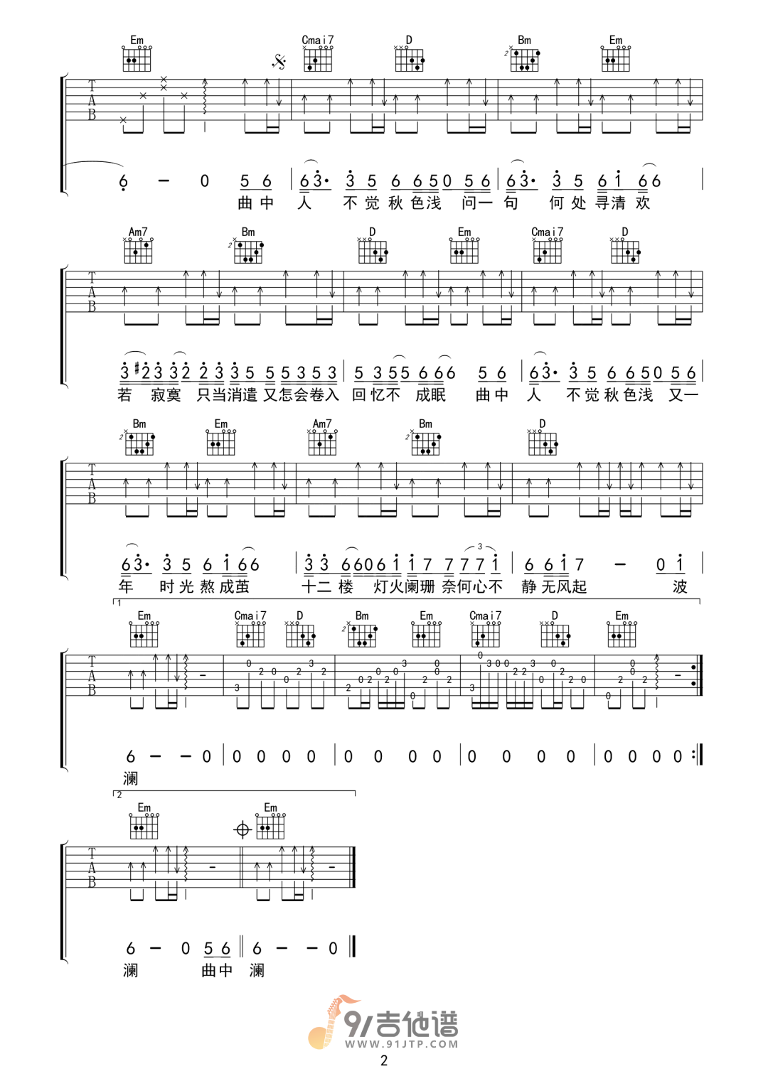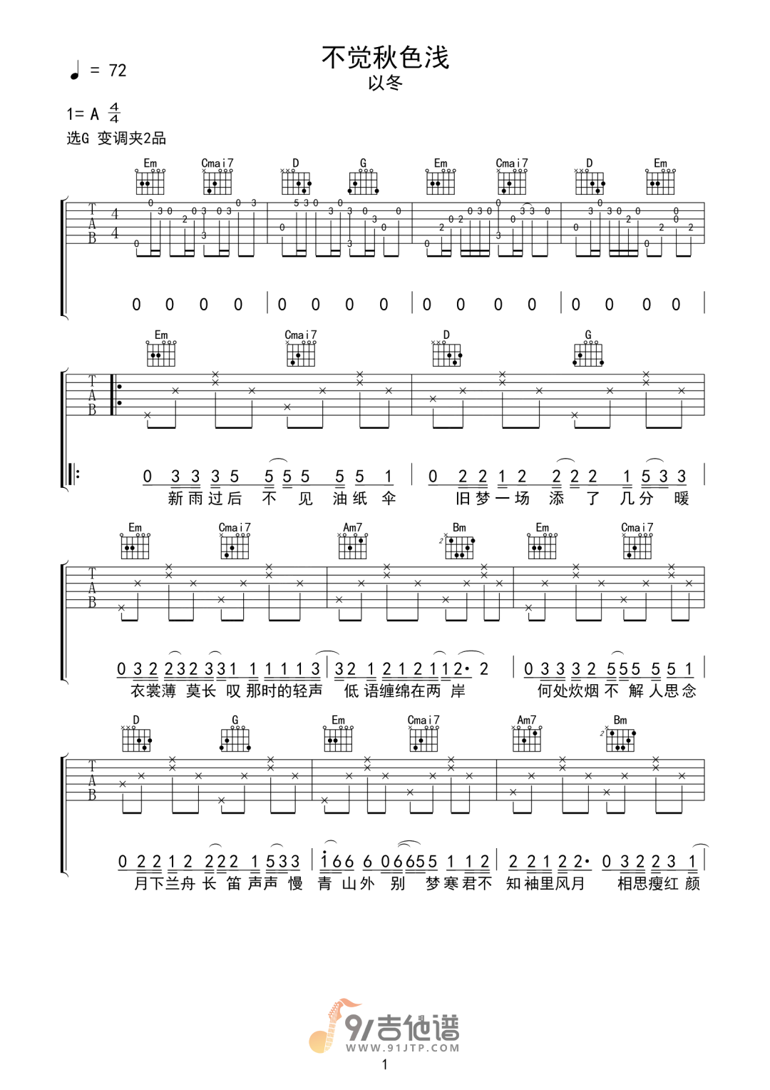 曲谱介绍: 曲谱简介:不觉秋色浅吉他谱,以冬演唱的一首歌曲,4/4拍的节奏,这首歌曲的原调为A调,这里曲谱采用了G调指法进行编配,演唱时夹变调夹2品可回到原调,也可根据个人实际嗓音情况选择。曲谱由琴谱网更新上传,共2张高清图片弹唱吉他谱例,曲谱来源于网络转载,编配制谱者暂不详。曲中人不觉秋色浅,问一句何处寻清欢,若寂寞只当消遣,又怎会卷入回忆不成眠;曲中人不觉秋色浅,又一年时光熬成茧,十二楼灯火阑珊,奈何心不静无风起波澜。