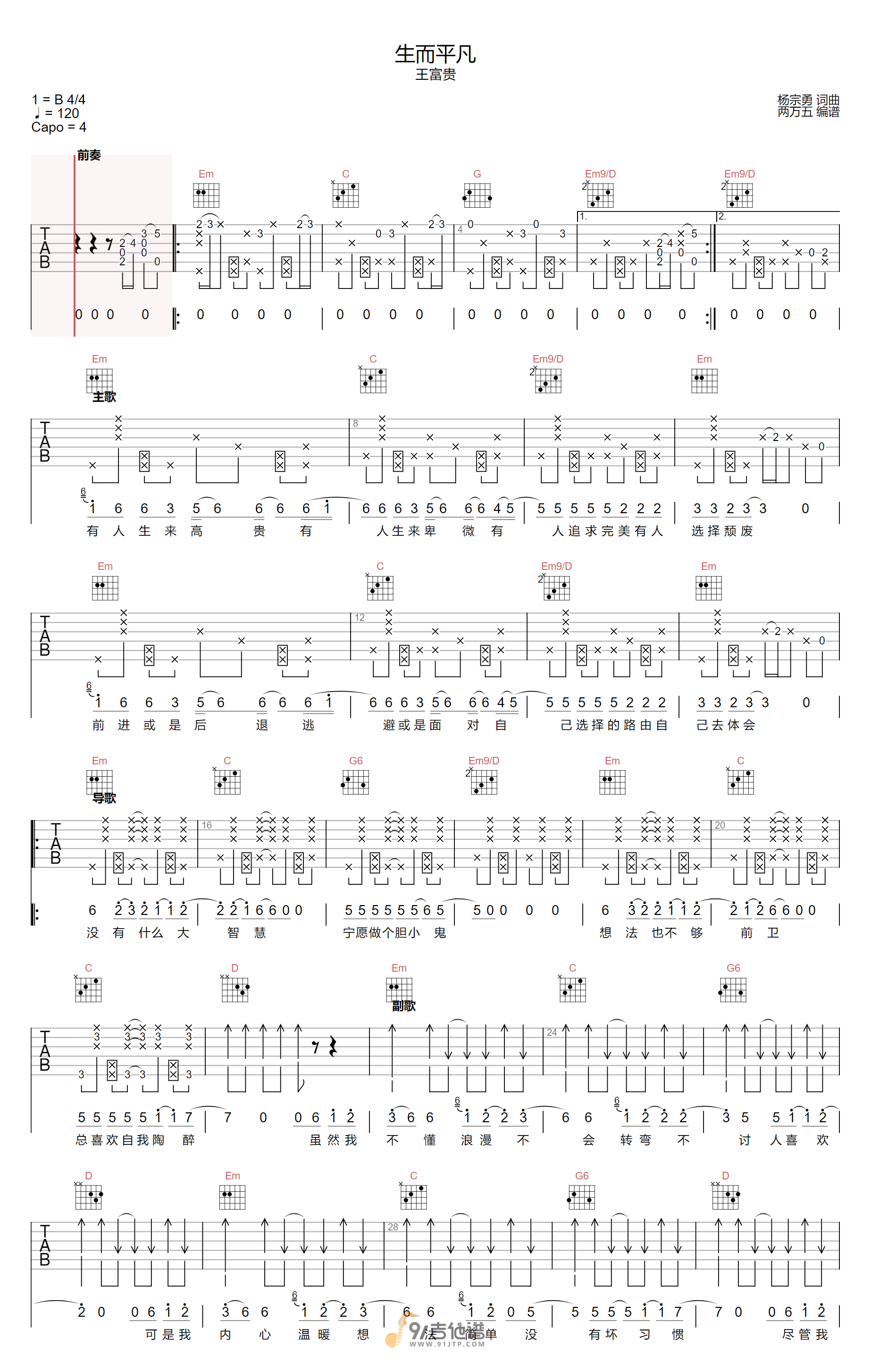 曲谱介绍: 曲谱简介:生而平凡吉他谱,王富贵演唱的一首歌曲,4/4拍的节奏,这首歌曲的原调为B调,这里曲谱采用了G调指法进行编配,演唱时夹变调夹4品可回到原调,也可根据个人实际嗓音情况选择。曲谱由两万五编配出品。