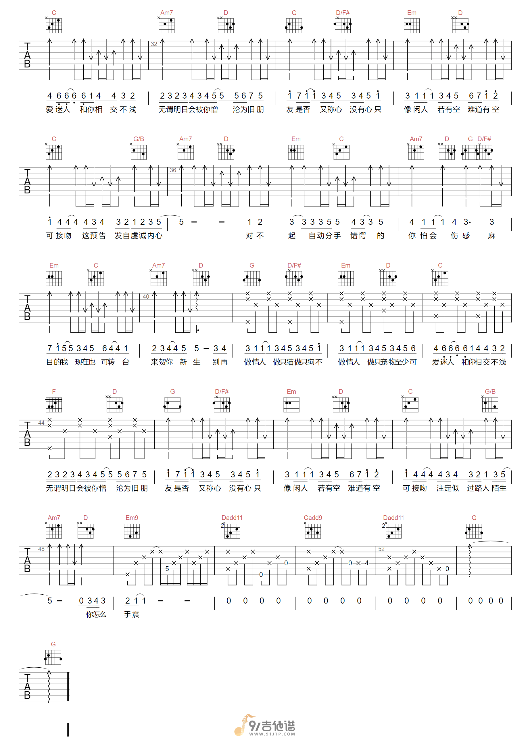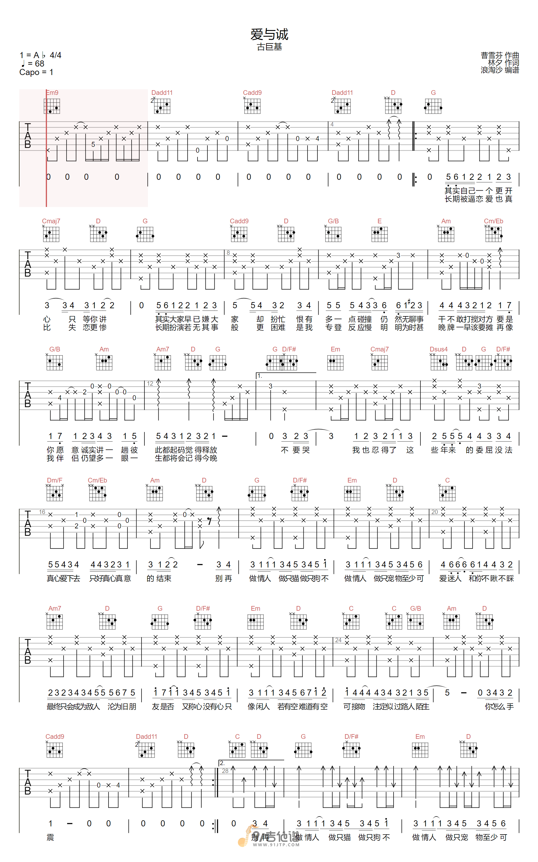 曲谱介绍: 曲谱简介:爱与诚吉他谱,古巨基演唱的一首歌曲,4/4拍的节奏,这首歌曲的原调为降A调,这里曲谱采用了G调指法进行编配,演唱时夹变调夹1品可回到原调,也可根据个人实际嗓音情况选择。曲谱由浪淘沙编配出品。这是一首触动人心的歌曲,林夕的歌词写出了一个长期被逼恋爱、苦不堪言,终于鼓起勇气和另一半坦诚内心,说出分手宣言的心情。