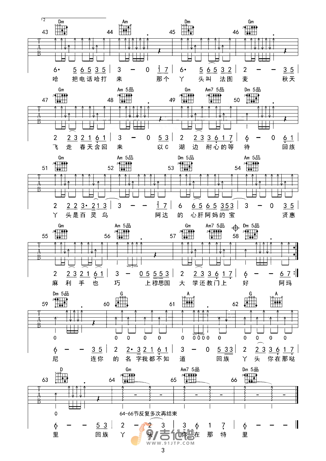 曲谱介绍: 曲谱简介:回族丫头吉他谱,苏尔东演唱的一首歌曲,4/4拍的节奏,这首歌曲的原调为F调,这里曲谱采用了F调指法进行编配,演唱时可不夹变调夹,曲谱由琴谱网更新上传,共3张高清图片弹唱吉他谱例,曲谱来源于网络转载,编配制谱者暂不详。