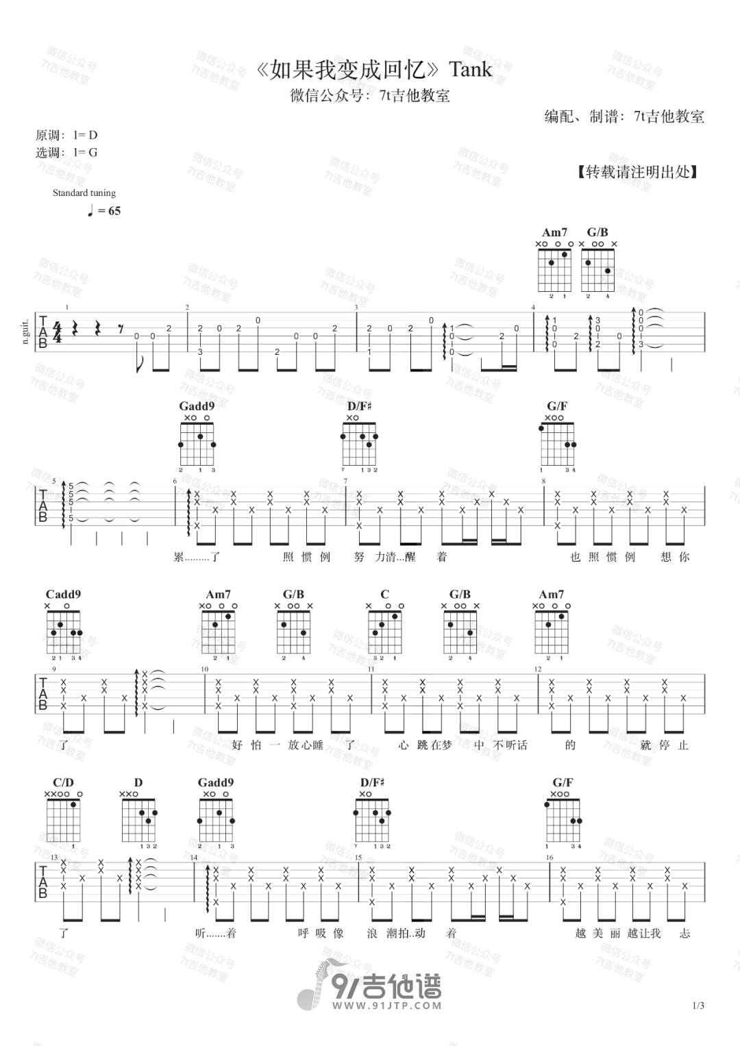 曲谱介绍: 曲谱简介:如果我变成回忆吉他谱,Tank演唱的一首歌曲,4/4拍的节奏,这首歌曲的原调为D调,这里曲谱采用了G调指法进行编配,演唱时可根据个人情况选择变调夹,曲谱由7T吉他教室编配出品。这首歌唱出了因遗传性的心脏疾病而无法掌控自己身体的不安。"好怕一放心睡了,心跳在梦中不听话的就停止了",这样的歌词不仅深刻而且感人。