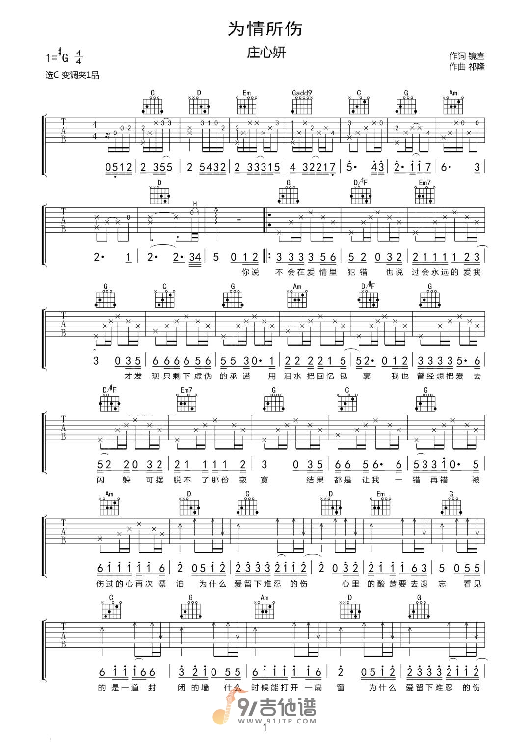 曲谱介绍: 曲谱简介:为情所伤吉他谱,庄心妍演唱的一首歌曲,4/4拍的节奏,这首歌曲的原调为降A调,这里曲谱采用了G调指法进行编配,演唱时夹变调夹1品可回到原调,也可根据个人实际嗓音情况选择。曲谱由琴谱网更新上传,共3张高清图片弹唱吉他谱例,曲谱来源于网络转载,编配制谱者暂不详。这首歌触动了多少曾经为情所伤的男女,句句戳心,太催泪了,含着眼泪听完。