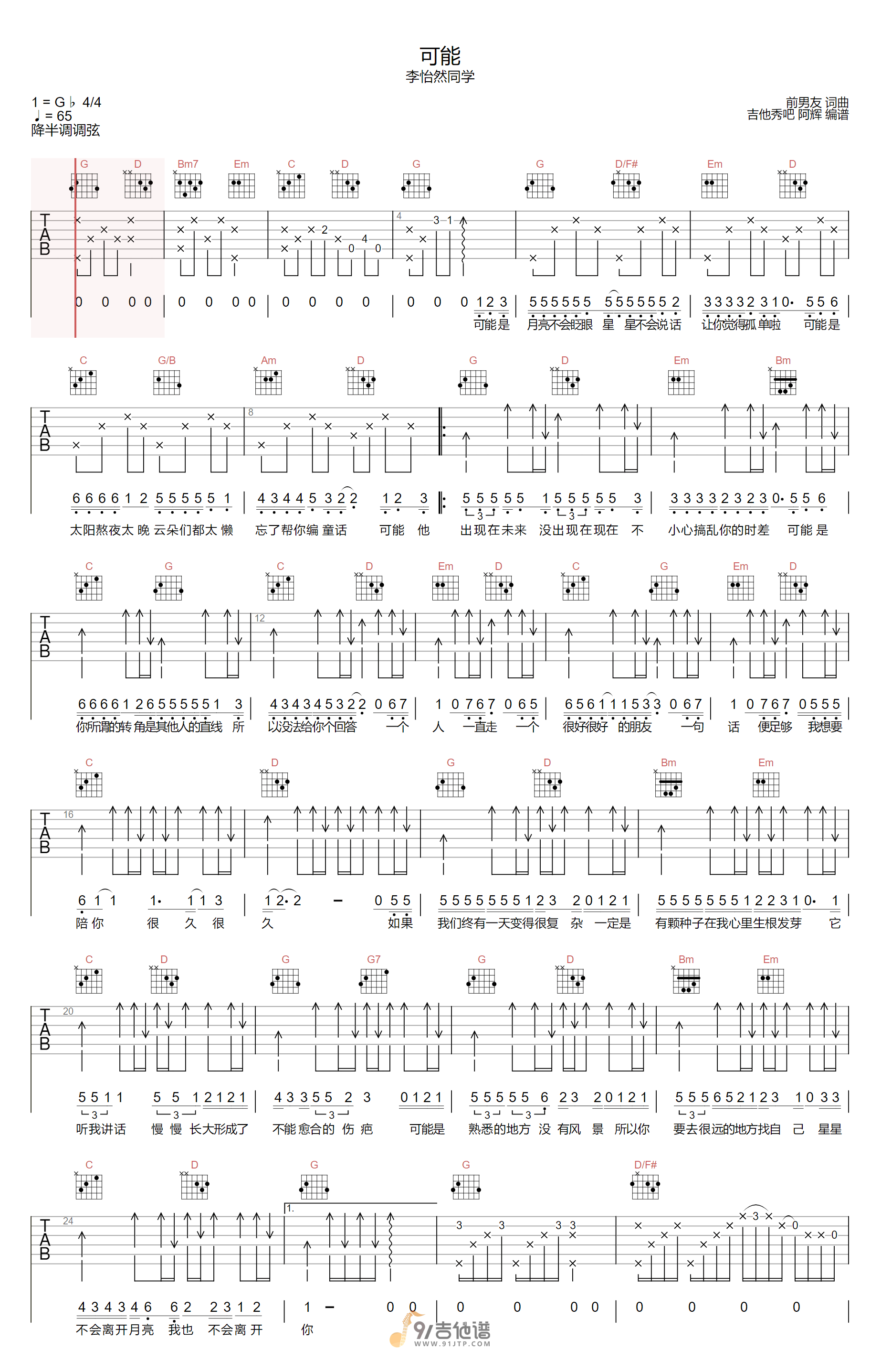 可能吉他谱 - 李怡然同学 - G调吉他弹唱谱 - 原版