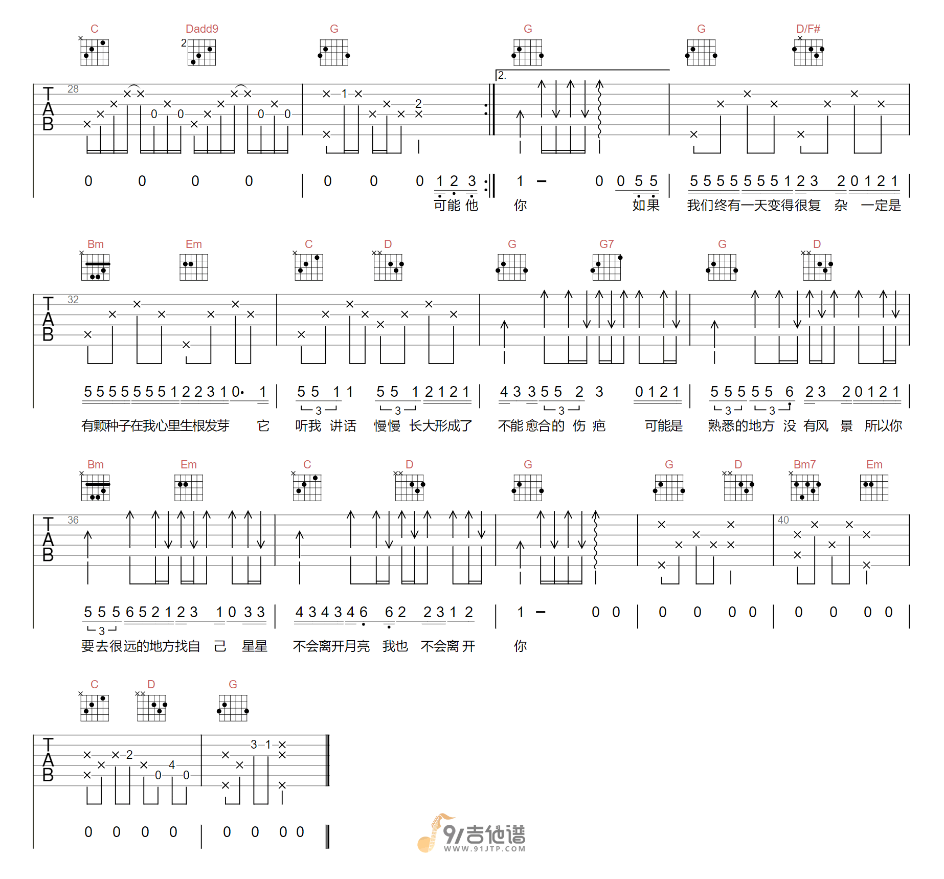曲谱介绍: 曲谱简介:可能吉他谱,李怡然同学演唱的一首歌曲,4/4拍的节奏,这首歌曲的原调为#F调,这里曲谱采用了G调指法进行编配,演唱时降半音调弦可回到原调,也可根据个人实际嗓音情况选择不降音或夹几品。曲谱由阿辉编配出品。“可能是月亮不会眨眼,星星不会说话,让你觉得孤单啦,可能是太阳熬夜太晚,云朵们都太懒,忘了帮你编童话。”