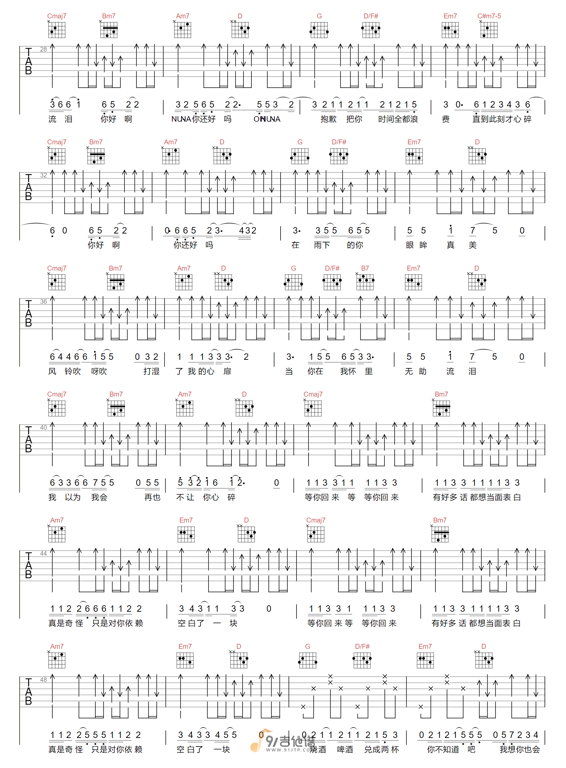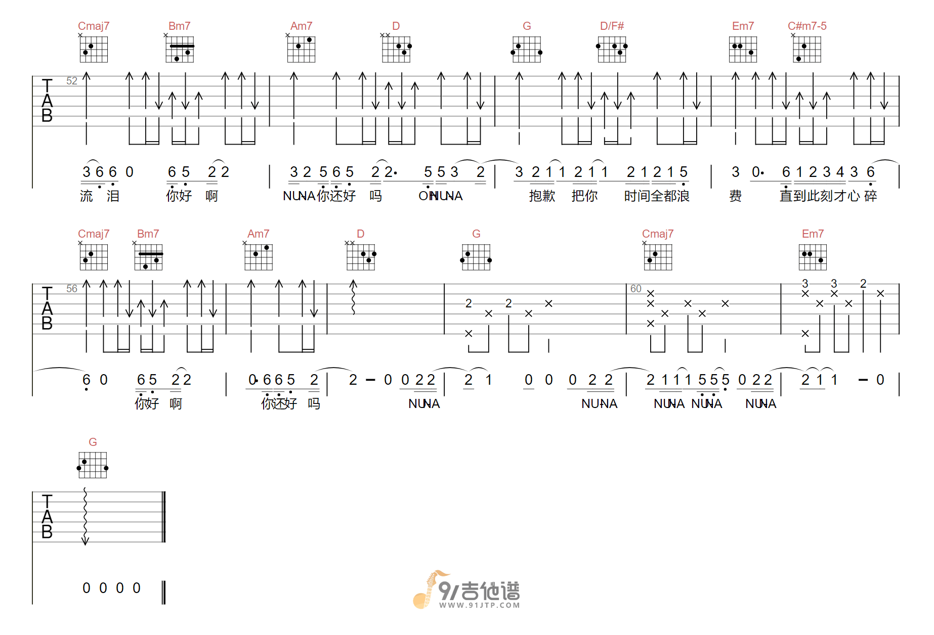 曲谱介绍: 曲谱简介:NUNA吉他谱,队长演唱的一首歌曲,4/4拍的节奏,这首歌曲的原调为#F调,这里曲谱采用了G调指法进行编配,演唱时降半音调弦可回到原调,也可根据个人实际嗓音情况选择不降音或夹几品。曲谱由浪淘沙编配出品。这首歌在保持以往队长经典气质外,融入了交响乐,为这首充满回忆的情歌增添了更加浓重的故事氛围感。一段弦乐间奏,把思绪拉回那个雨夜,分不清你眼里的是雨是还是泪。