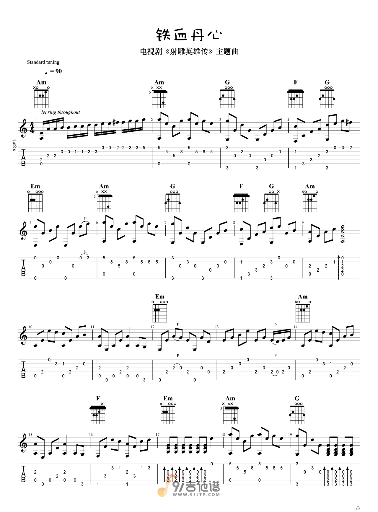 曲谱介绍: 曲谱简介:铁血丹心指弹吉他谱,罗文的一首指弹吉他曲目,这首曲子采用的是标准调弦,4/4拍的节奏,无需特殊调音。演奏时建议夹变调夹4品,也可根据个人实际情况选择。曲谱由琴谱网更新上传,共3张高清图片指弹吉他谱例,曲谱来源于网络转载,编配制谱者暂不详。这首歌是97版《射雕英雄传》的主题曲,这里是由网友Topper根据歌曲改编制谱的指弹吉他版本,指法难度不大,另外谱中也将参考和弦标注出来,更方便了指法的安排,不懂的地方可以参考指法吉他教学视频。