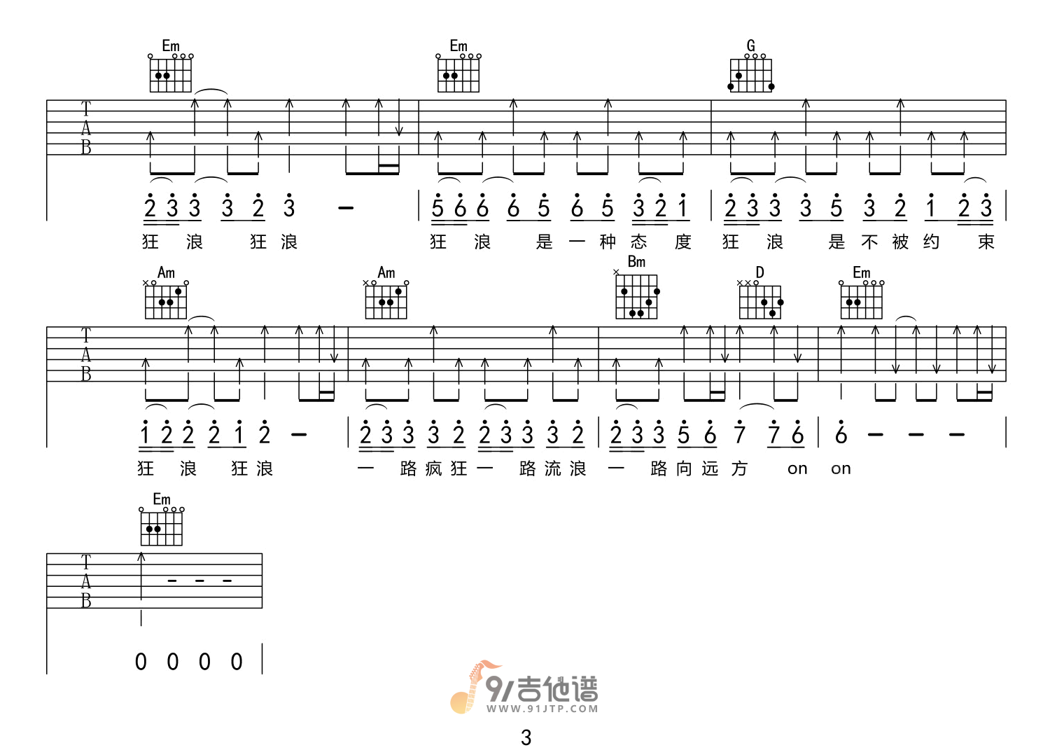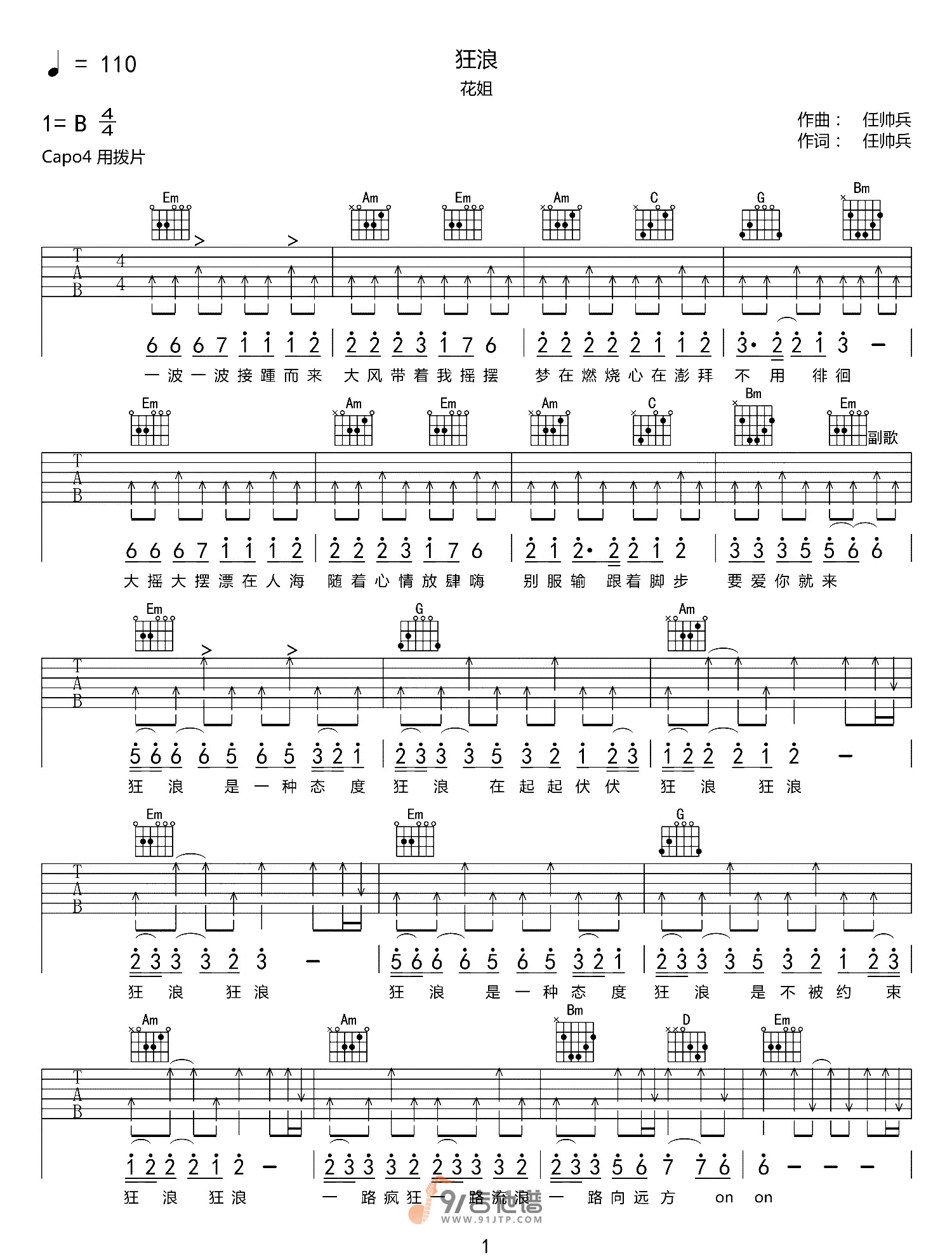 曲谱介绍: 曲谱简介:狂浪吉他谱,花姐演唱的一首歌曲,4/4拍的节奏,这首歌曲的原调为B调,这里曲谱采用了G调指法进行编配,演唱时夹变调夹4品可回到原调,也可根据个人实际嗓音情况选择。曲谱由琴谱网更新上传,共3张高清图片弹唱吉他谱例,曲谱来源于网络转载,编配制谱者暂不详。