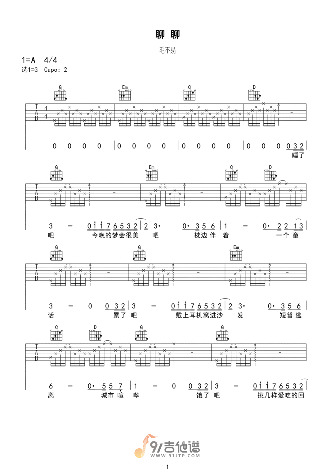 聊聊吉他谱 - 毛不易 - G调吉他弹唱谱 - 原版