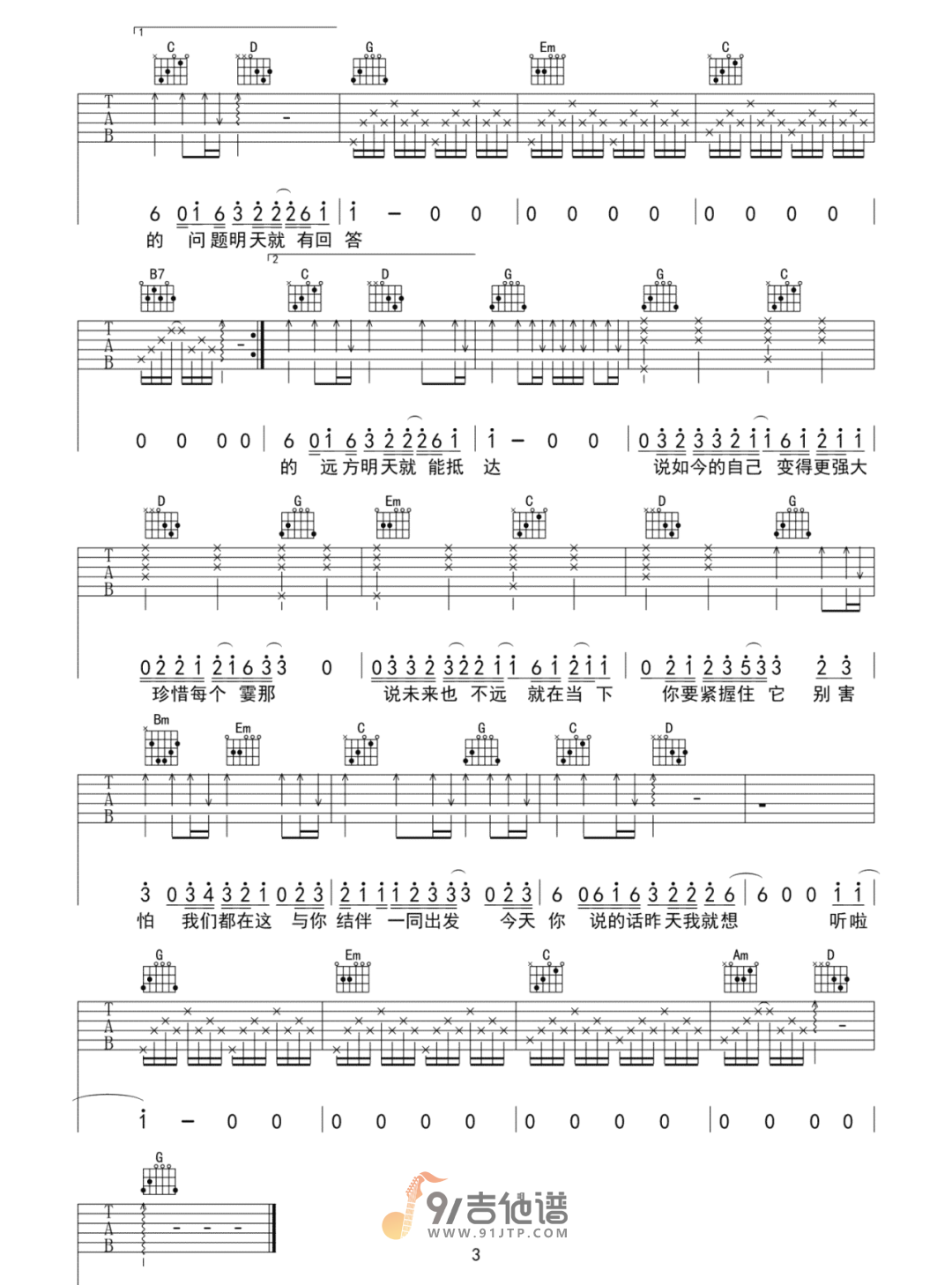 曲谱介绍: 曲谱简介:聊聊吉他谱,毛不易演唱的一首歌曲,4/4拍的节奏,这首歌曲的原调为A调,这里曲谱采用了G调指法进行编配,演唱时夹变调夹2品可回到原调,也可根据个人实际嗓音情况选择。曲谱由琴谱网更新上传,共3张高清图片弹唱吉他谱例,曲谱来源于网络转载,编配制谱者暂不详。这首歌是喜马拉雅十周年特别企划主题曲,温暖的旋律,缓缓道来的语气,像是疲惫生活里的慰藉,像是一个老友或者知心人,用温柔的语气问你过得好吗,平庸日常,繁忙的生活,都市里奔忙的一代人,那种细腻歌词里的代入感,真的让人很动容。