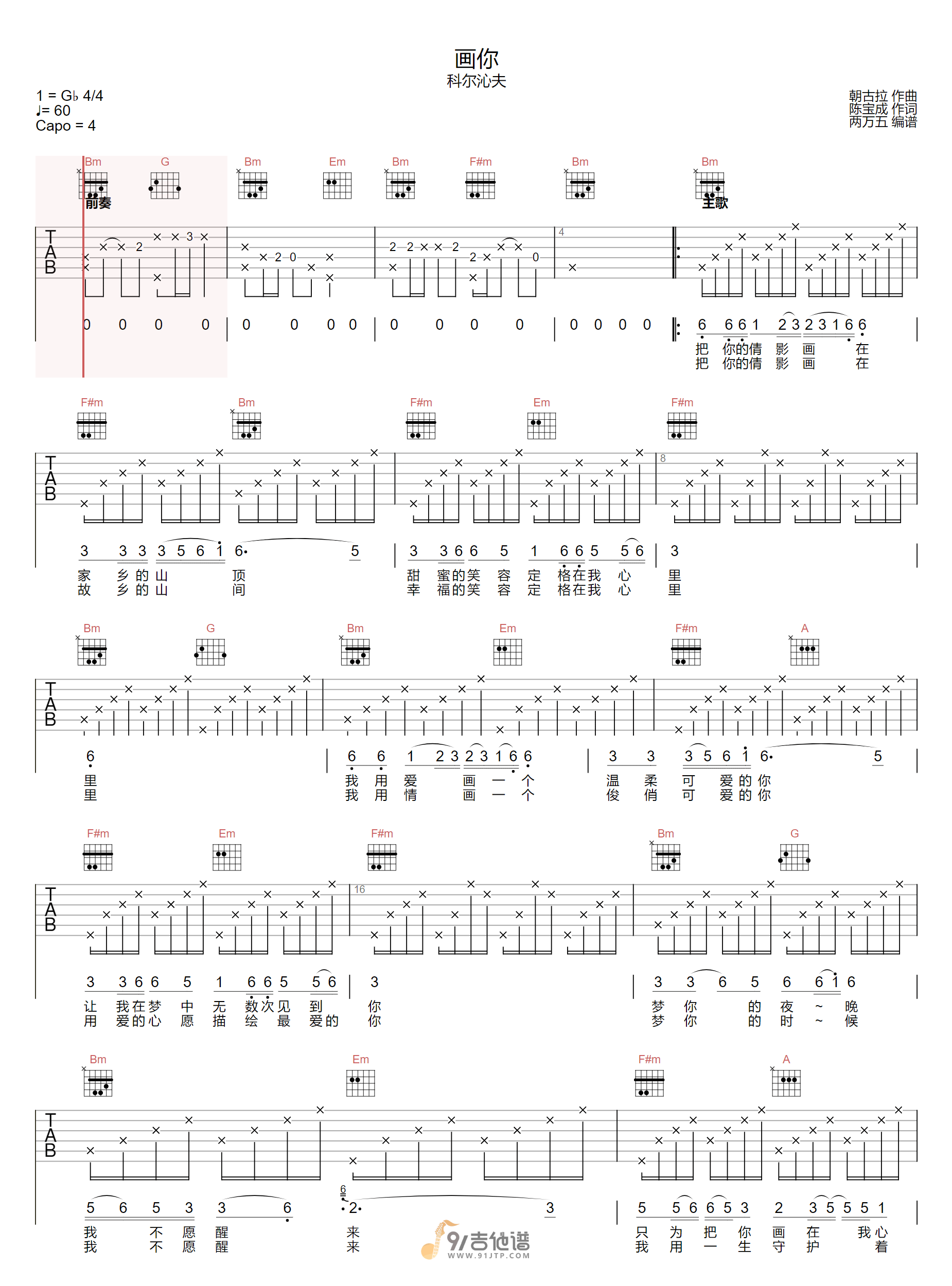 曲谱介绍: 曲谱简介:画你吉他谱,科尔沁夫演唱的一首歌曲,4/4拍的节奏,这首歌曲的原调为#F调,这里曲谱采用了D调指法进行编配,演唱时夹变调夹4品可回到原调,也可根据个人实际嗓音情况选择。曲谱由两万五编配出品。草原歌声是从一个民族的心灵里流淌出来的,岁月的底蕴丰富了它的内涵,民族的风情优美了它的旋律,这首歌曲表达的就是内心的思念之情、藏在心里变成一幅画。