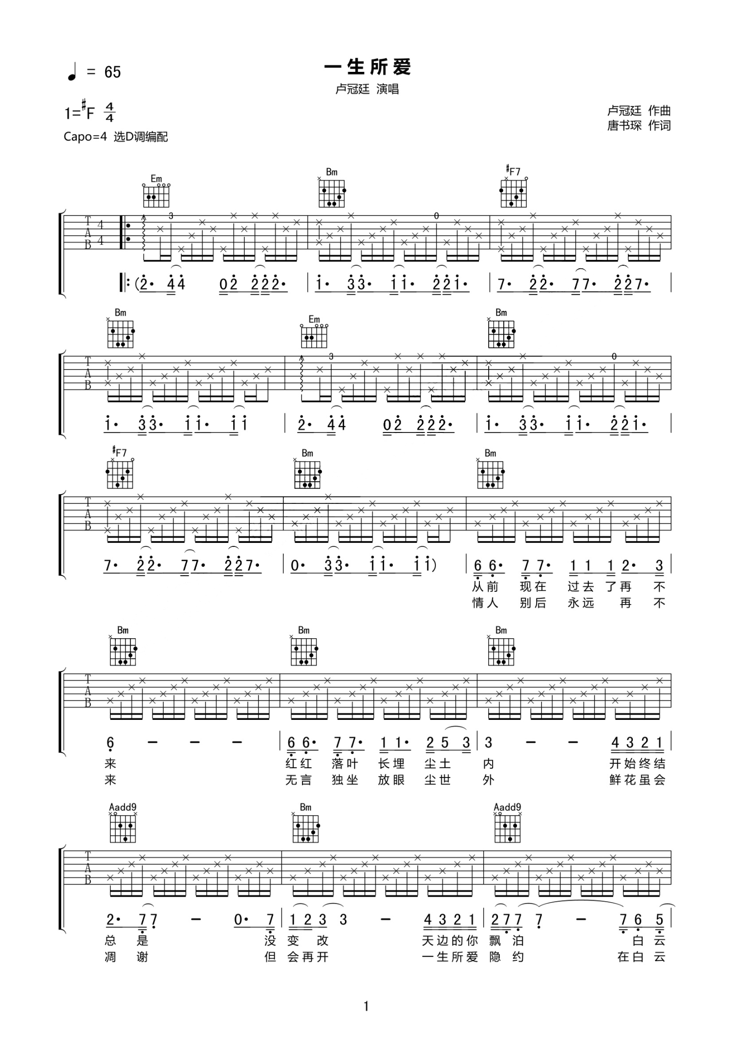 曲谱介绍: 卢冠廷《一生所爱》吉他谱_D调吉他弹唱谱