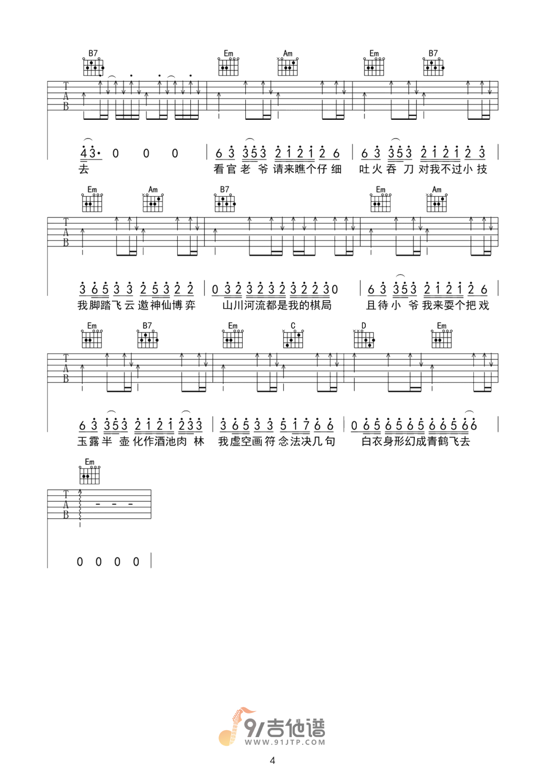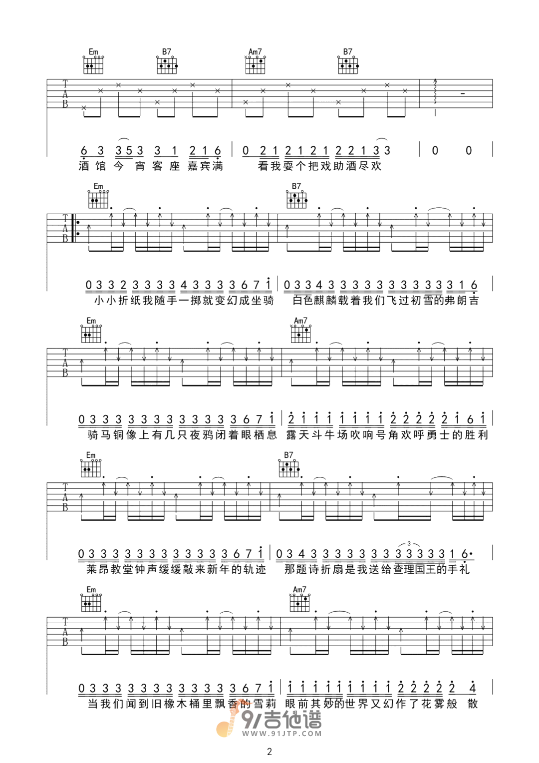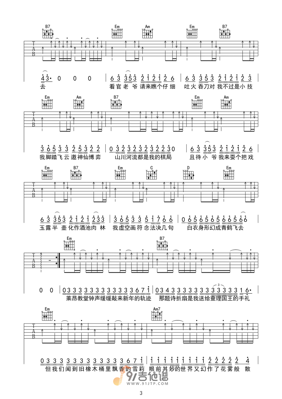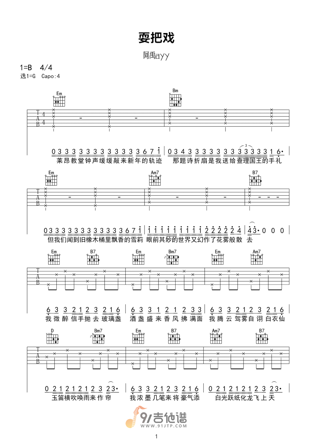 曲谱介绍: 曲谱简介:耍把戏吉他谱,阿禹ayy演唱的一首歌曲,4/4拍的节奏,这首歌曲的原调为B调,这里曲谱采用了G调指法进行编配,演唱时夹变调夹4品可回到原调,也可根据个人实际嗓音情况选择。曲谱由琴谱网更新上传,共4张高清图片弹唱吉他谱例,曲谱来源于网络转载,编配制谱者暂不详。在这首歌中,阿禹ayy以其魅惑的嗓音,带你穿越中世纪。从充满魔幻气息的欧洲古堡,听夜鸦的叹息,到人声潮动的露天斗牛场,吹响号角欢呼勇士的胜利。