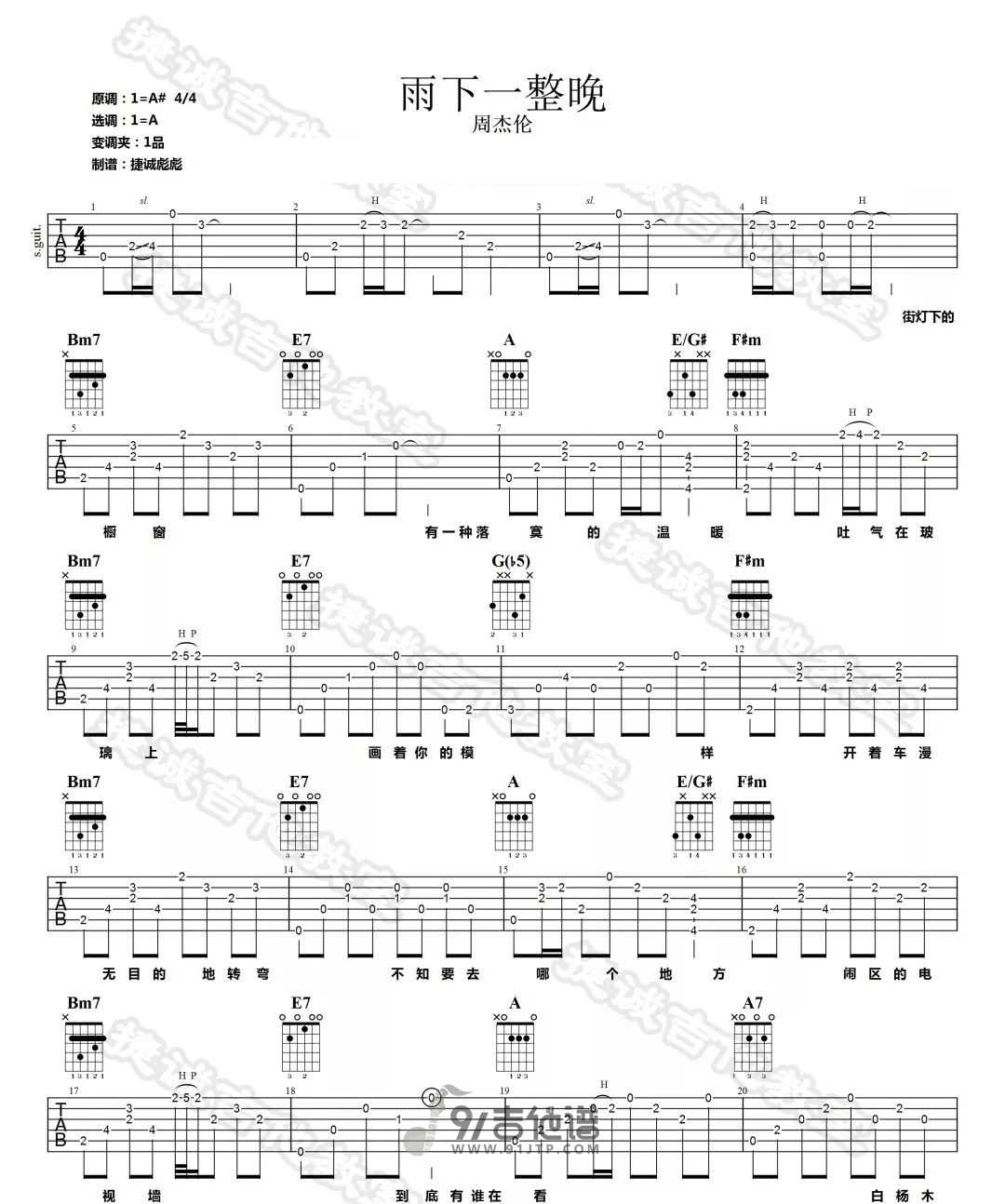 曲谱介绍: 曲谱简介:雨下一整晚吉他谱,周杰伦演唱的一首歌曲,4/4拍的节奏,这首歌曲的原调为降B调,这里曲谱采用了A调指法进行编配,演唱时夹变调夹1品可回到原调,也可根据个人实际嗓音情况选择。曲谱由捷诚吉他教室编配出品。这首歌同以往的中国风歌曲不同,此次还加入了一些小品的元素,这首歌调很慢歌声很温柔,是一首很适合下雨的时候听的音乐。