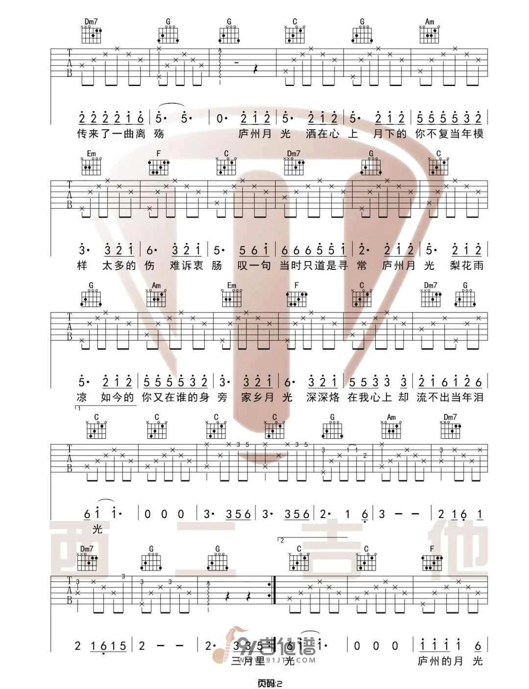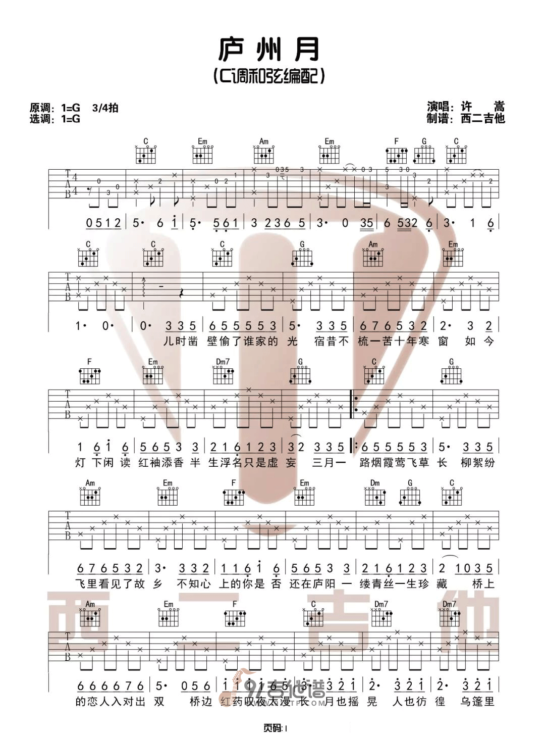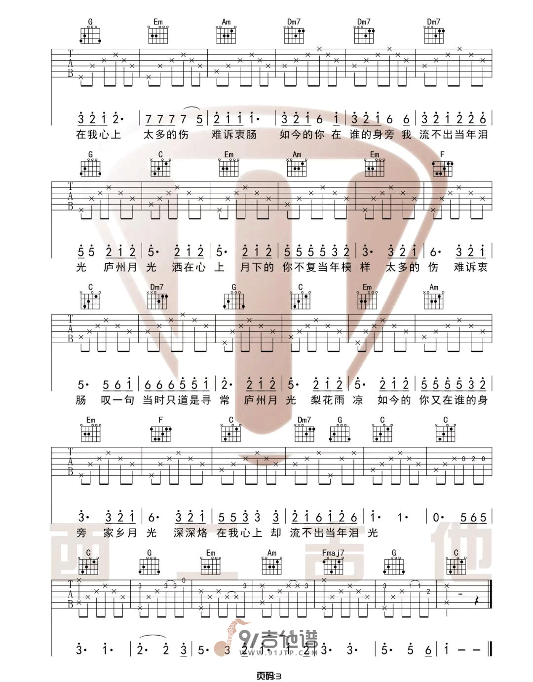 曲谱介绍: 曲谱简介:庐州月吉他谱,许嵩演唱的一首歌曲,3/4拍的节奏,这首歌曲的原调为G调,这里曲谱采用了G调指法进行编配,演唱时可不夹变调夹,曲谱由山山吉他编配出品。这首歌的内容意思为庐州的月亮依然是当时月亮,但是当年月光下的两个人已经各奔东西了,这首歌蕴含了对友人的无尽思念。